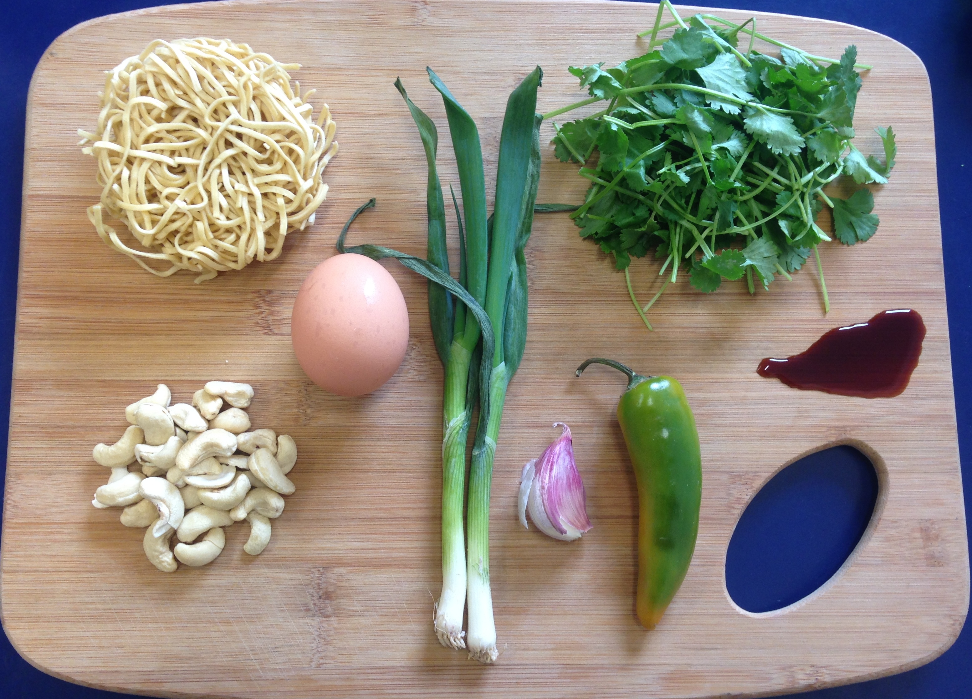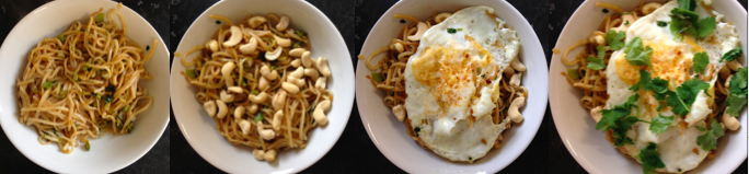 To assemble, put the noodles into a bowl, sprinkle with cashew nuts, top with the egg and then use some scissors to chop the coriander over the dish. This is when you can either squeeze over some lime juice or simply a few extra splashes of soy sauce. Now dig out your chopsticks (or fork..) and enjoy!