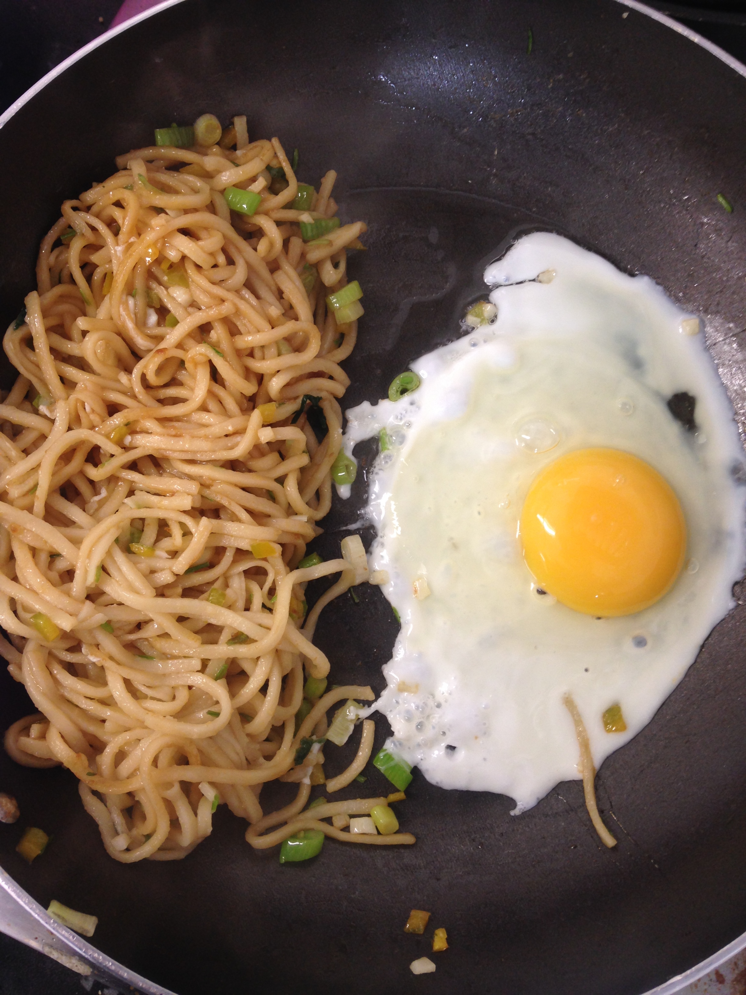 Put a medium frying pan on a high heat and add about a tablespoon of oil, when the oil is hot add the onions, garlic, chilli and coriander stalks and fry for 2-3 minutes. While these are frying, take your noodles off the heat and drain, then add to the frying pan. Stir in the noodles, then move to one side of the pan, add a tiny bit more oil and crack the egg into the other side of the pan. This saves washing up, trust me! Fry the egg however you like it, then add the soy sauce to the noodles and mix them about a bit with some tongs, or failing this two forks, keeping them separate from the egg.