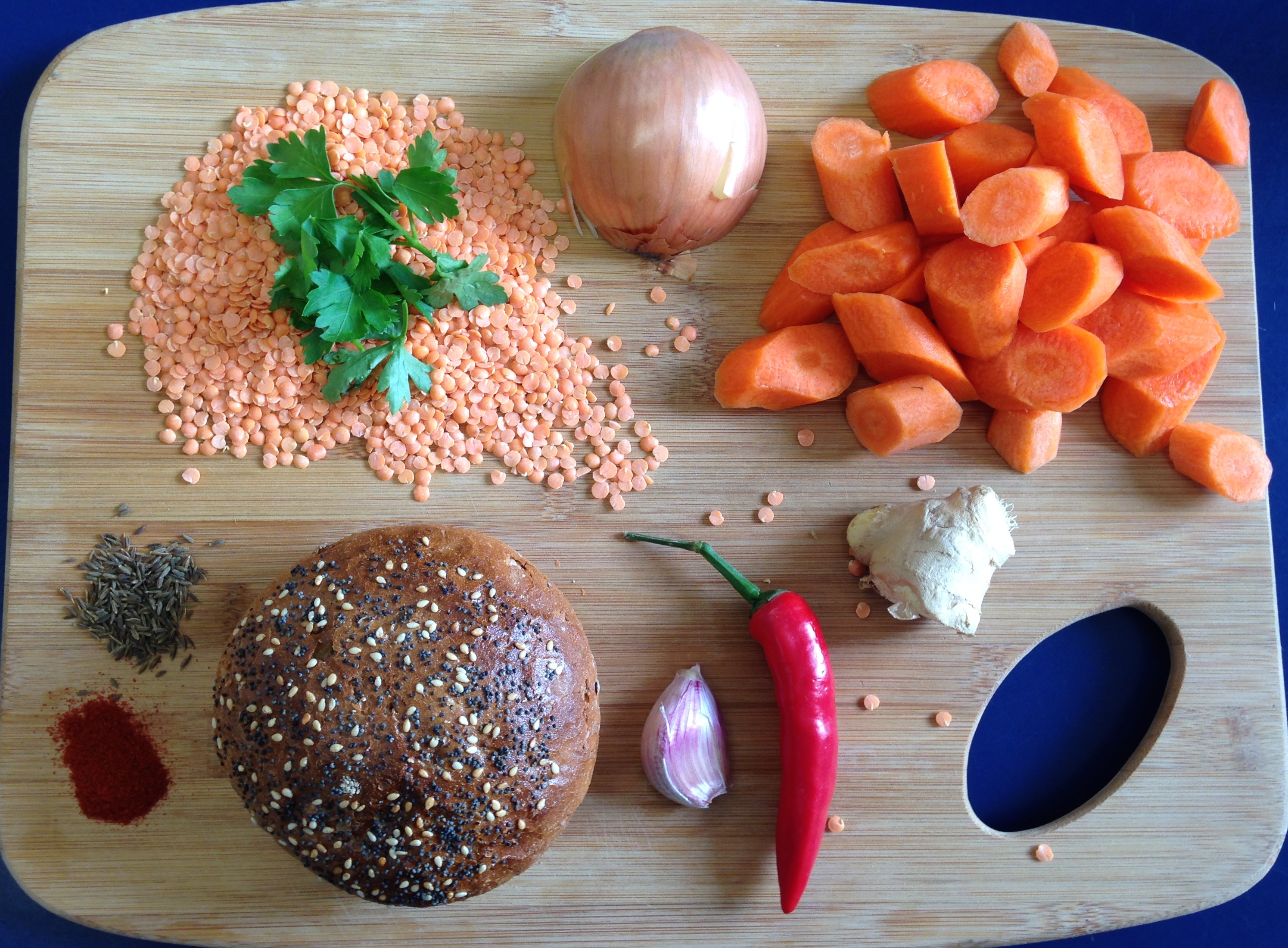 Start by peeling and chopping up your carrots into rough chunks, size doesn’t matter too much here as you’ll be blending them up later. Then finely chop your onion, chilli, garlic and peeled ginger. Put a large saucepan on a medium heat with around a tablespoon of oil and once the pan is hot, add the onion, garlic, chilli and ginger. Fry and stir every now and again for about 5 minutes. Then add the carrots, three quarters of the lentils, cumin and paprika and cook for a further 5 minutes.