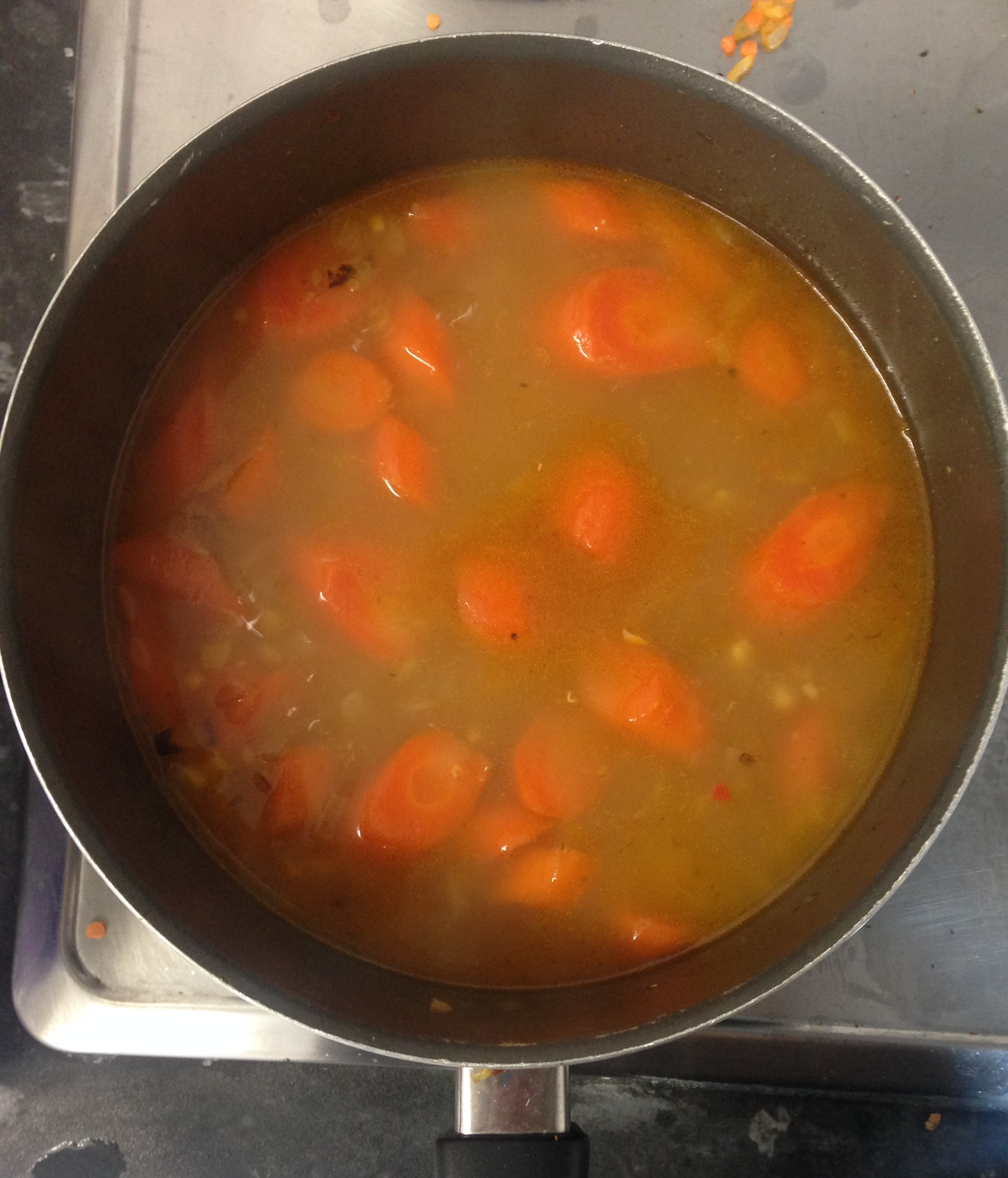 While the veg and lentils are cooking, boil the kettle and make up 800ml of vegetable stock then add to the pan. Put a lid on the pan and turn the heat down to low and leave to simmer for about 30 minutes, stirring occasionally. After this time, the water should have reduced a little and the carrot and lentils will be soft, then add salt and pepper to taste. Use a handheld stick blender to blend out the lumps of carrot in the soup until relatively smooth. Now add the remaining lentils and put back on the hob for about 15 minutes. I add lentils in afterwards for a little more texture, as I prefer soup to be slightly chunky!