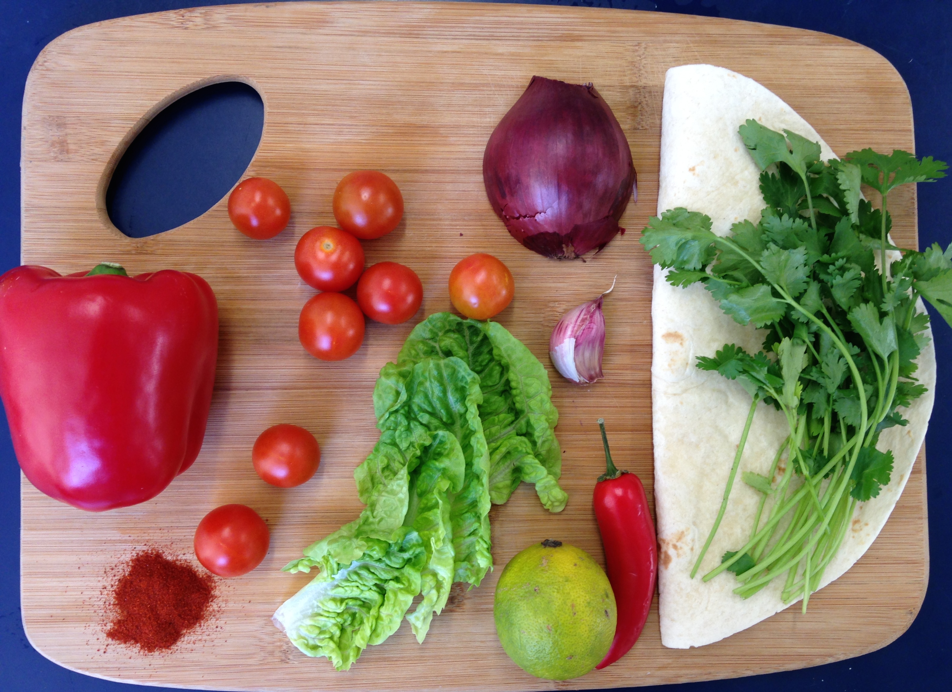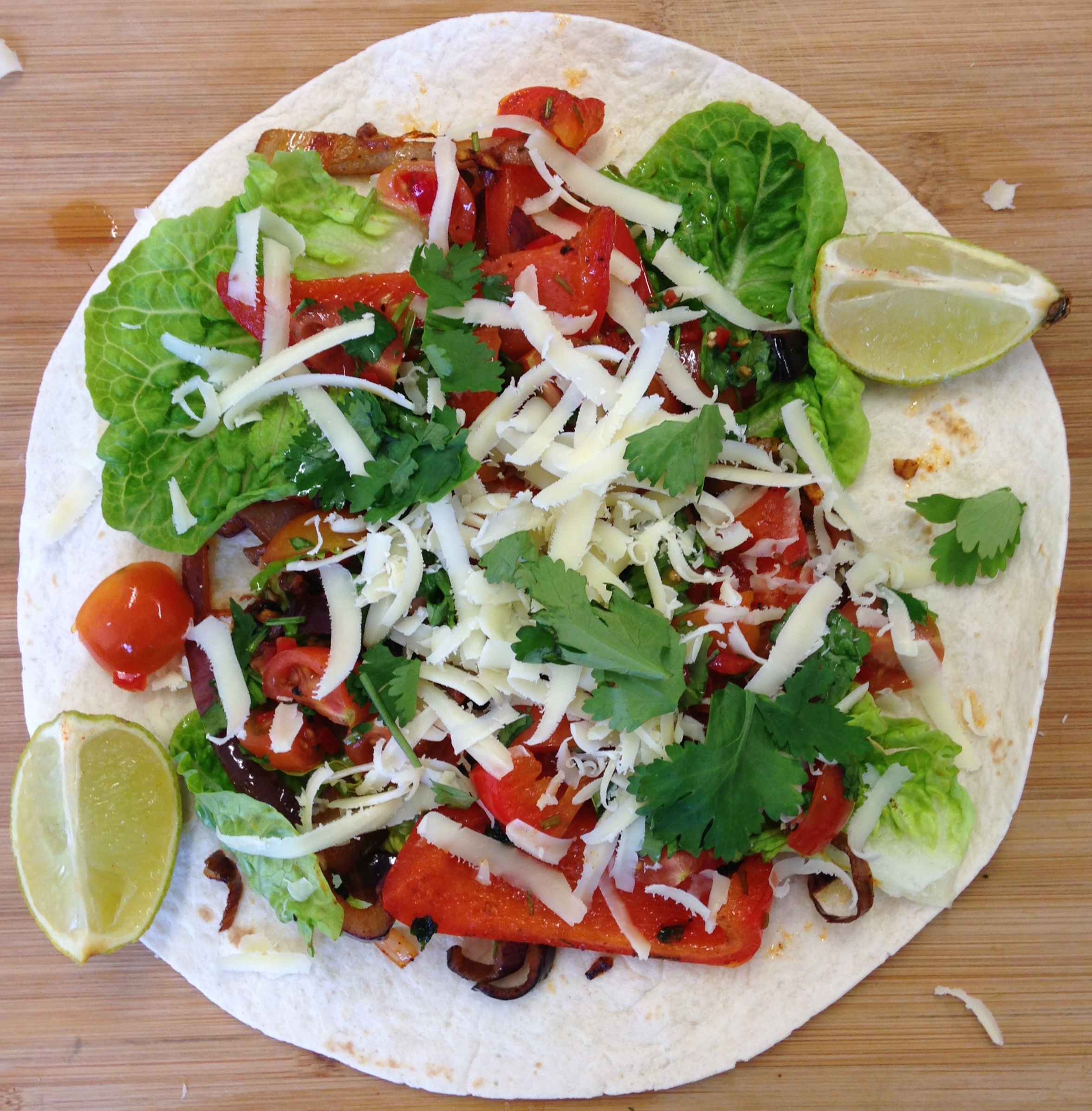 Slice the onion thinly, followed by thick slices of the pepper. Then finely chop the garlic and coriander stalks. Put about 1 tbsp of olive oil into a frying pan and once the oil is hot, add the garlic, coriander, paprika, pepper and onion. Fry until the onions are soft but the peppers are still a little crunchy, then serve on the wraps with lettuce, salsa and cheese.