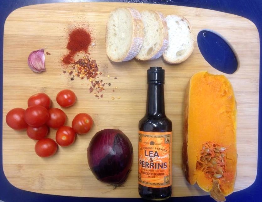 While the tomatoes, onion and garlic are cooking, scoop out the flesh of the squash and add it to a medium frying pan with a little olive oil and the paprika. Fry for 5-10 minutes then season and set aside. Slice up your roll or bread and put it in the oven for a couple of minutes to toast.Take the tomatoes out of the oven to cool slightly, followed by the bread.