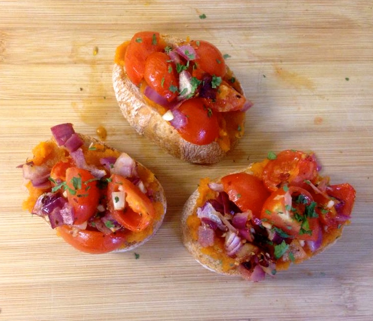 I only used half a baked butternut squash in my last recipe, so this a good way to use up the leftover squash without having to buy too many ingredients. Although bruschetta is usually made using raw tomatoes, I’ve roasted them with red onions, garlic and olive oil to complement the paprika in the squash. This is in some ways a winter bruschetta, it’s warm and spicy, best served on toasted ciabatta as a starter for a few or lunch for one!