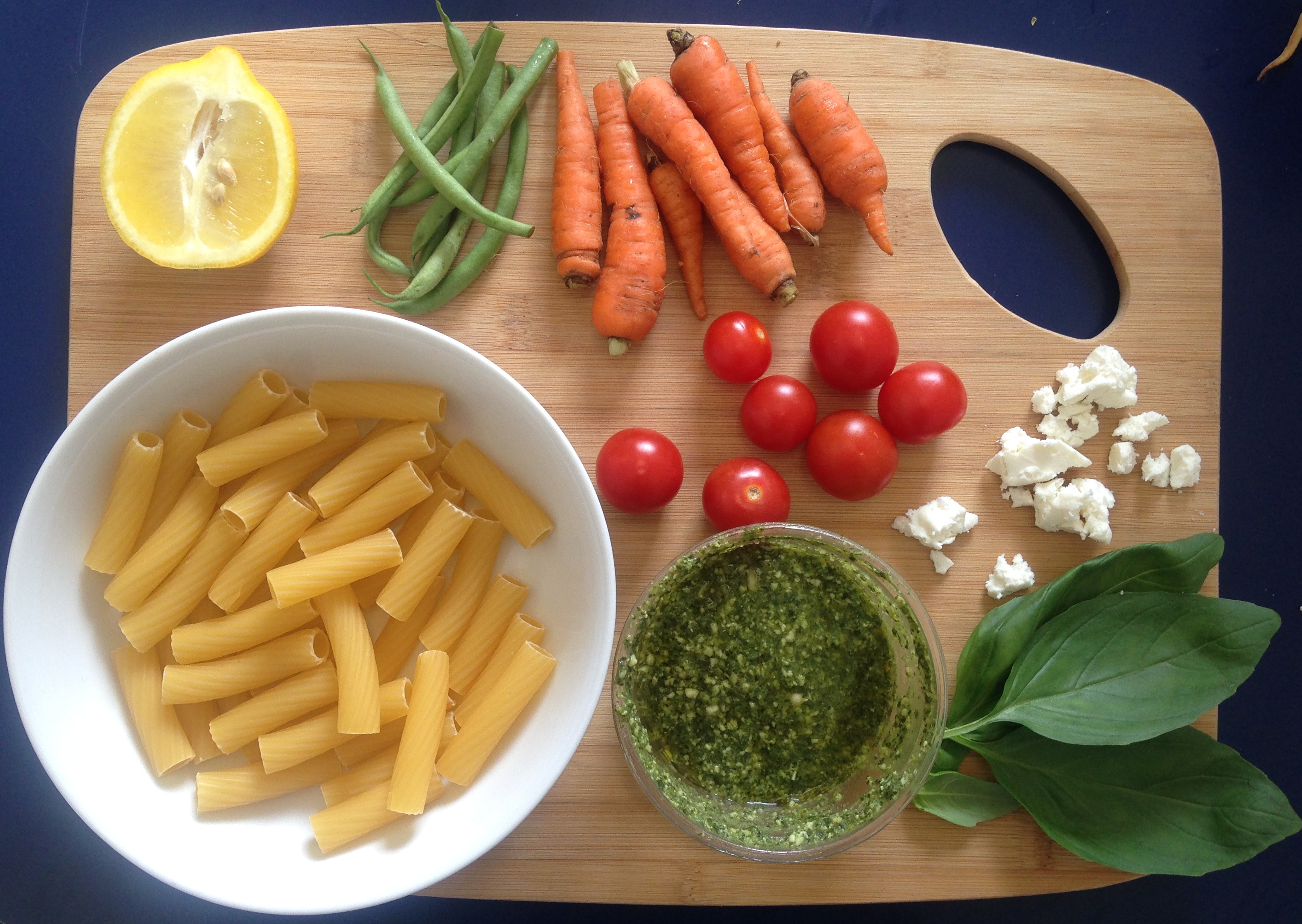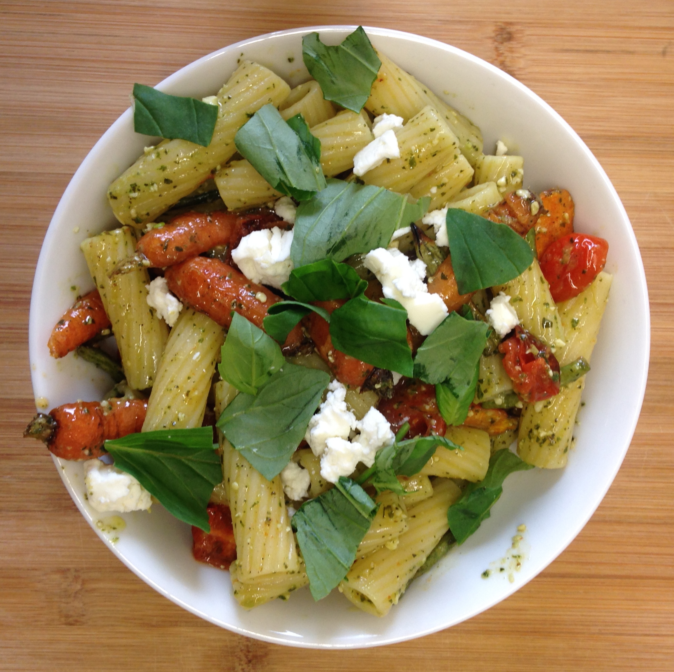 Start by chopping up the veg and putting it with a drizzle of olive oil and a pinch of salt and pepper on a baking tray. Place in the oven at 200 degrees and roast for 15-20 minutes. While the veg is in the oven, put the pasta on to boil according to packet instructions with a pinch of salt and drop of oil.