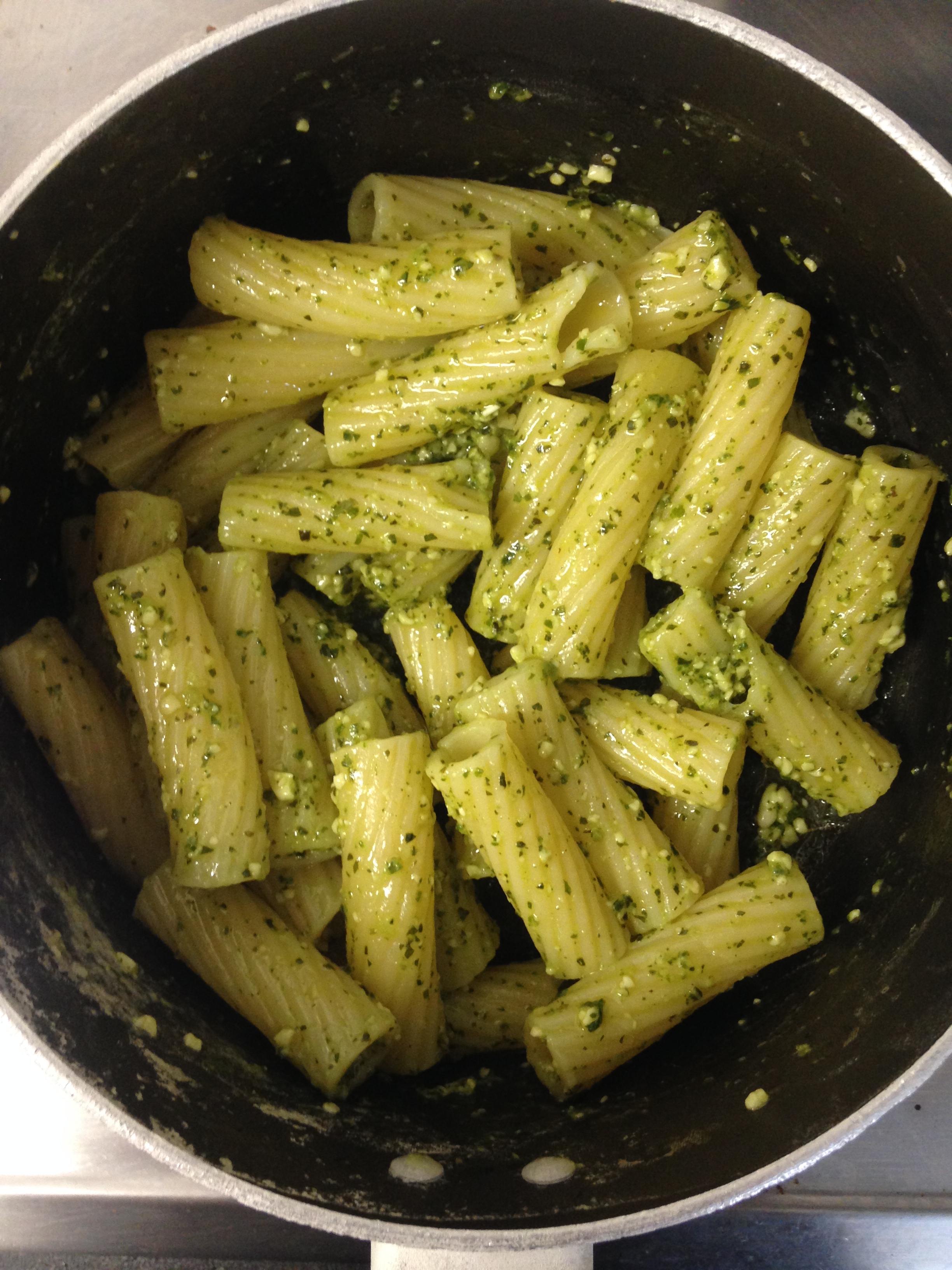 Once the pasta has boiled, drain the water and add the pesto. Stir until all the pasta has been covered, then squeeze over the juice of half a lemon and stir again. Take the veg out of the oven and add to the pasta, then tip all of this into a bowl.