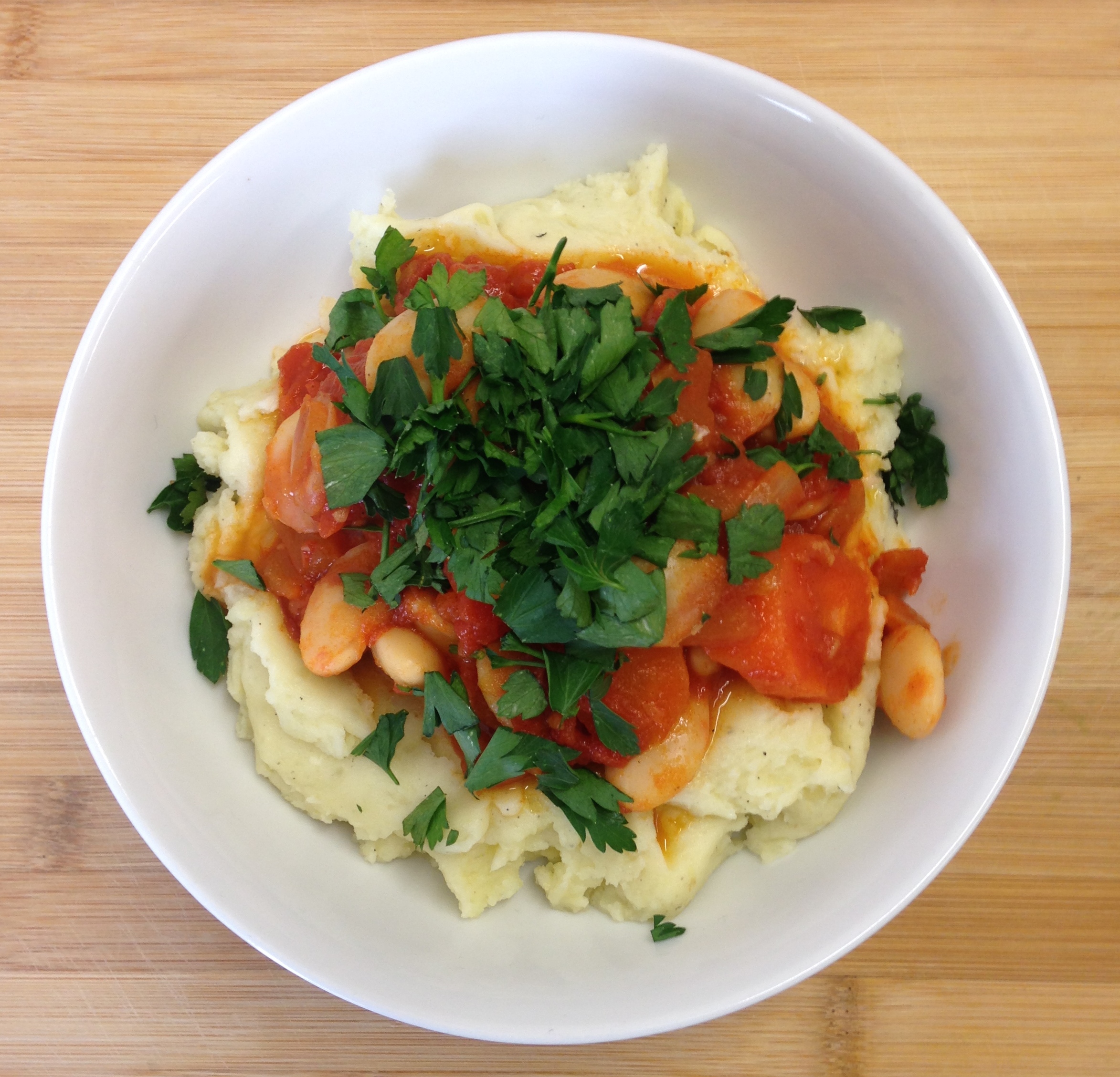 Use a knife to test if the potatoes are soft, once they are, drain away the water and mash with about 20g of butter, the garlic clove and salt and pepper. Take the lid off of the beans, stir through to make sure that the sauce has thickened and test the carrots with a knife to check they are cooked through. To serve, spoon your mash into a bowl and ladle the beans on top and sprinkle with parsley. Really simple and delicious!