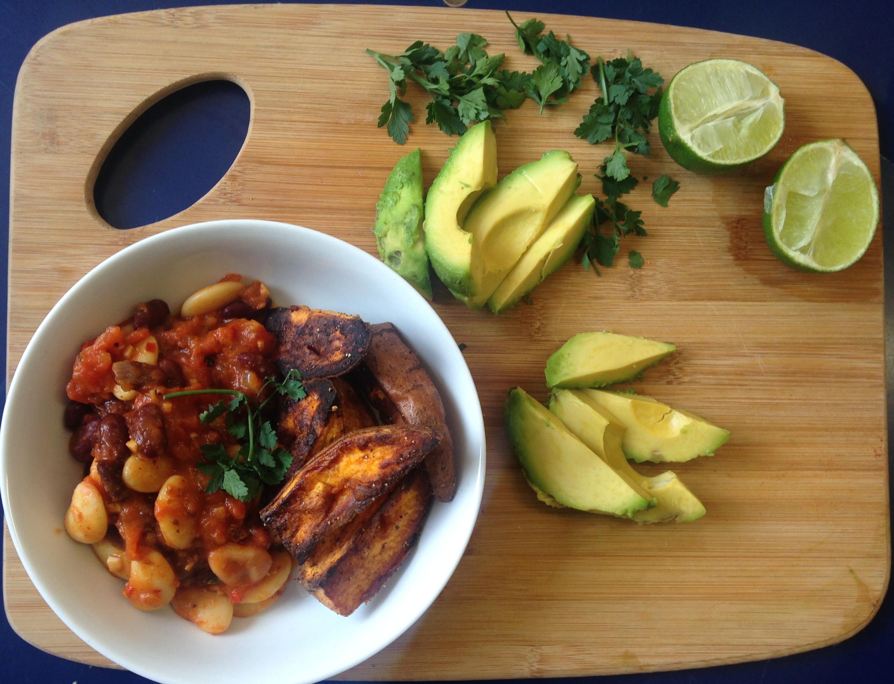 This dish is really easy to make, and although it’s not as quick as some of my others it’s worth the extra cooking time to get the beans tender and the potatoes nice and fluffy. The chilli is also unbelievably good for you, and it doesn’t even look like rabbit food! You have tomatoes, two types of beans, sweet potato and avocado. All really good for you as well as tasty. I havn’t posted a recipe in a while, so I hope you enjoy this one as much I enjoyed cooking it!