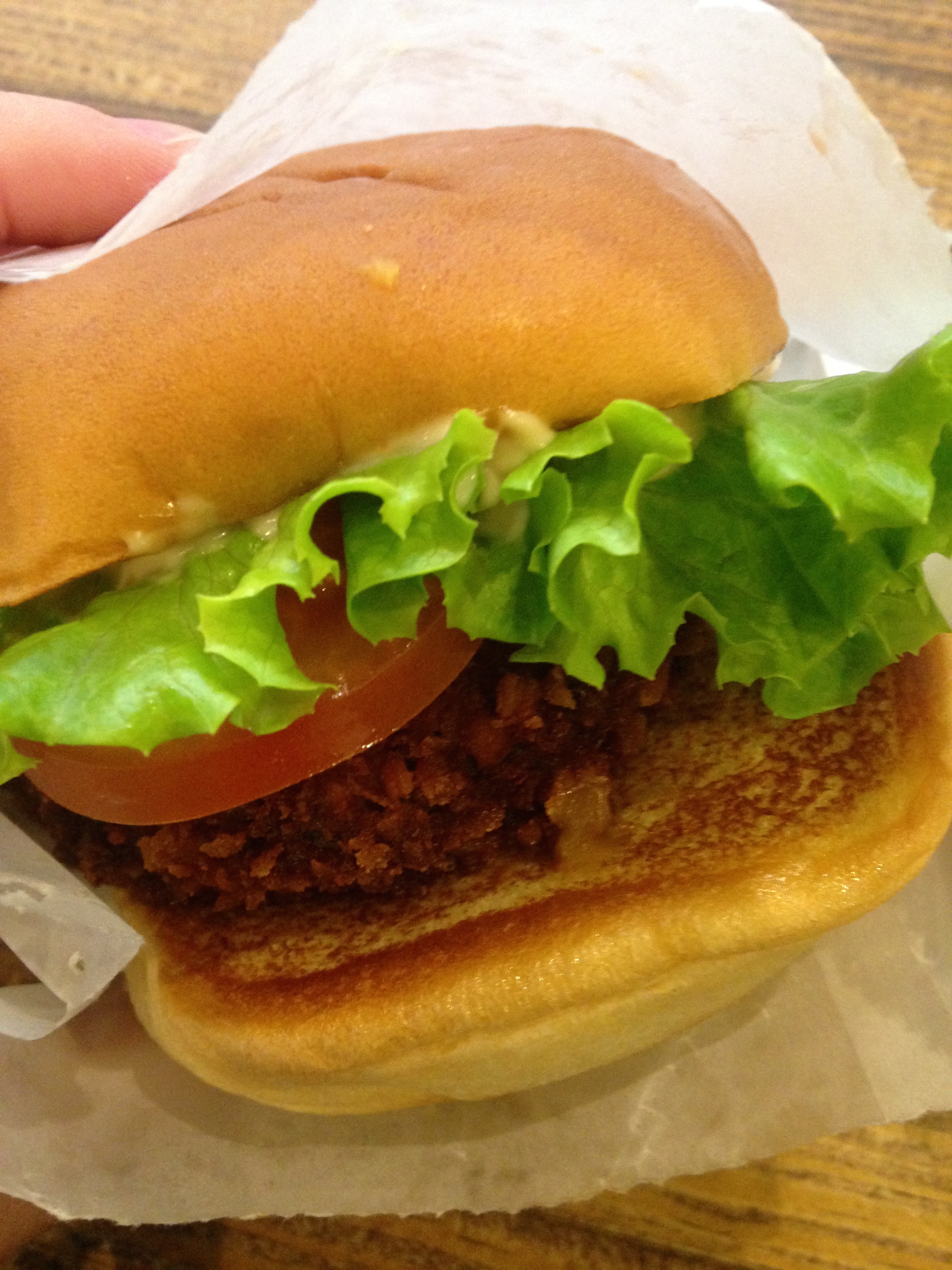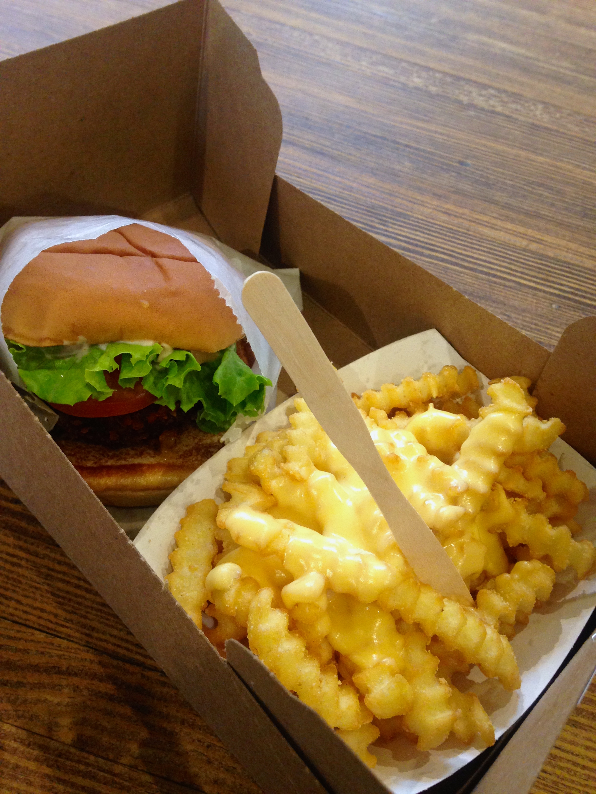 I’ve been on my perfect veggie burger quest again! This week when out with friends we decided to celebrate the end of the term with a visit to Covent Garden’s Shake Shack, and I was not disappointed. The restaurant is like upmarket fast food, you choose from the menu and place your order then wait for it to arrive through a hatch before taking it to your table. The staff were lovely and unrushed, which makes a change from some central London chains, and the food was ready within 5 minutes. There are plenty of places to sit and eat, inside and out, and on a Tuesday afternoon you’re more than spoilt for choice.