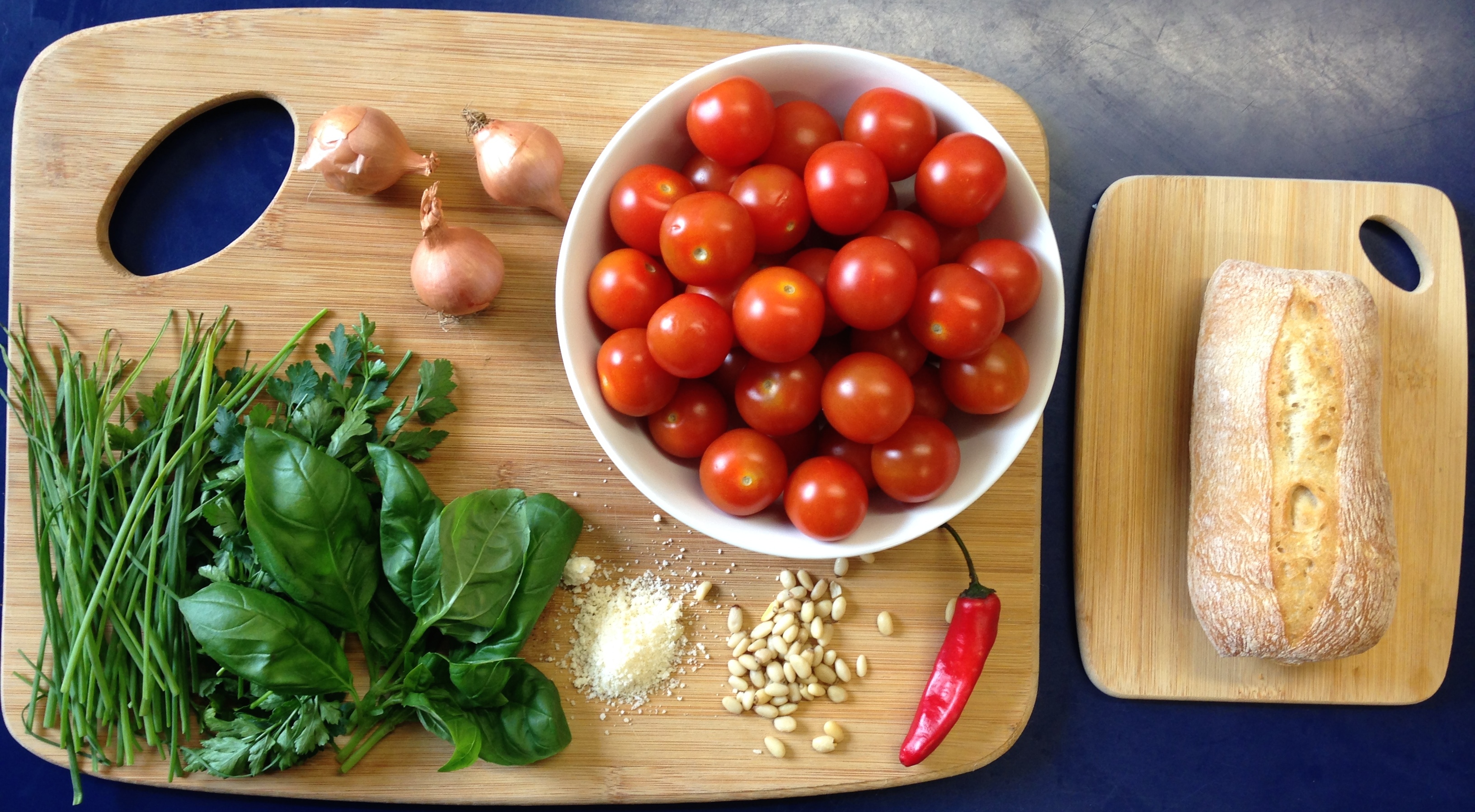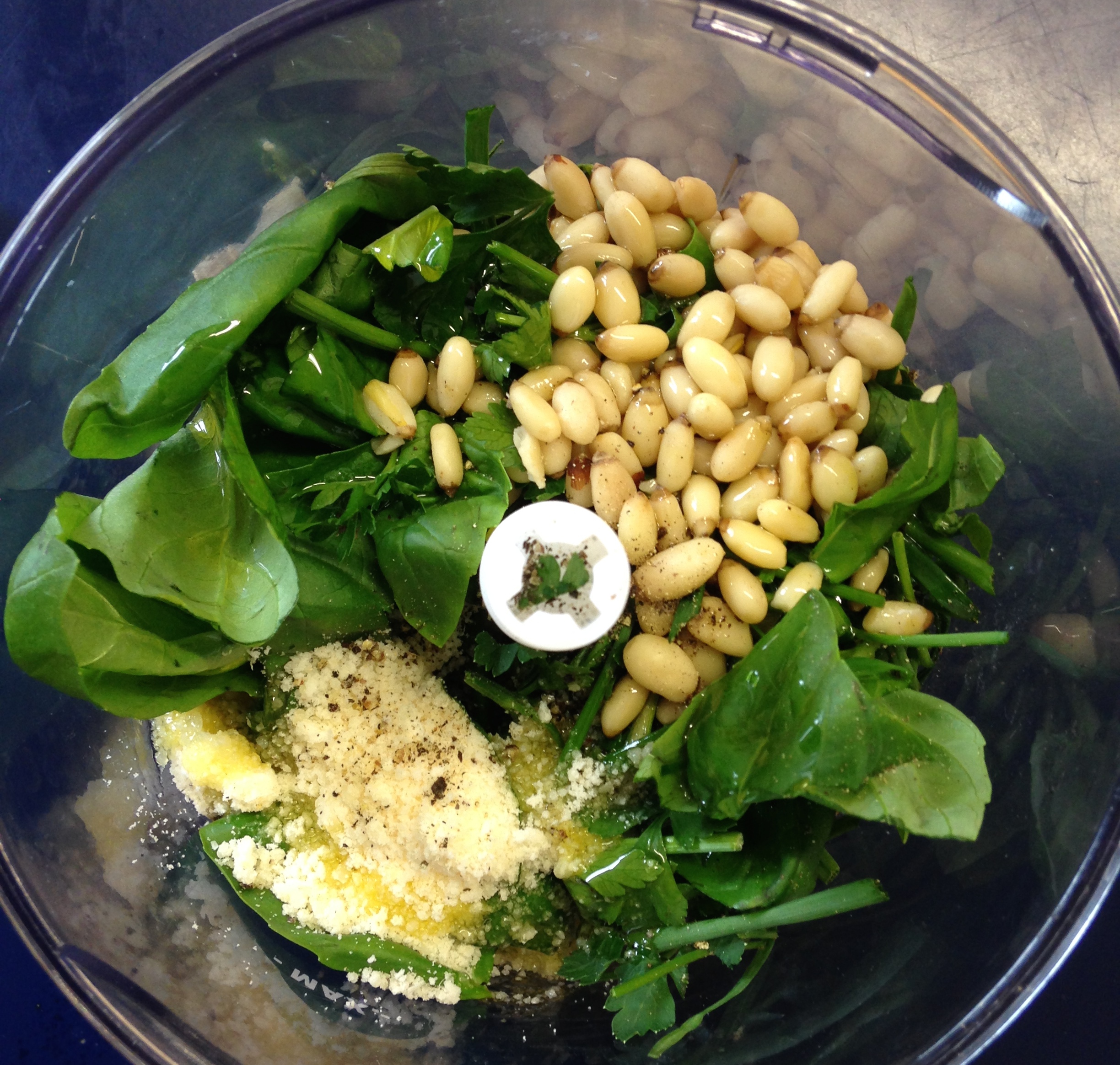 While the tomatoes are cooking, roughly chop your herbs and add to a small chopper or processor. Also add the pine nuts, parmesan, olive oil and some black pepper. Use the chopper/processor (I’ve linked the one I use at the end of this post, it’s really affordable and useful for chopping onions too!) to blend the ingredients together until they produce a soft, dropping consistency.