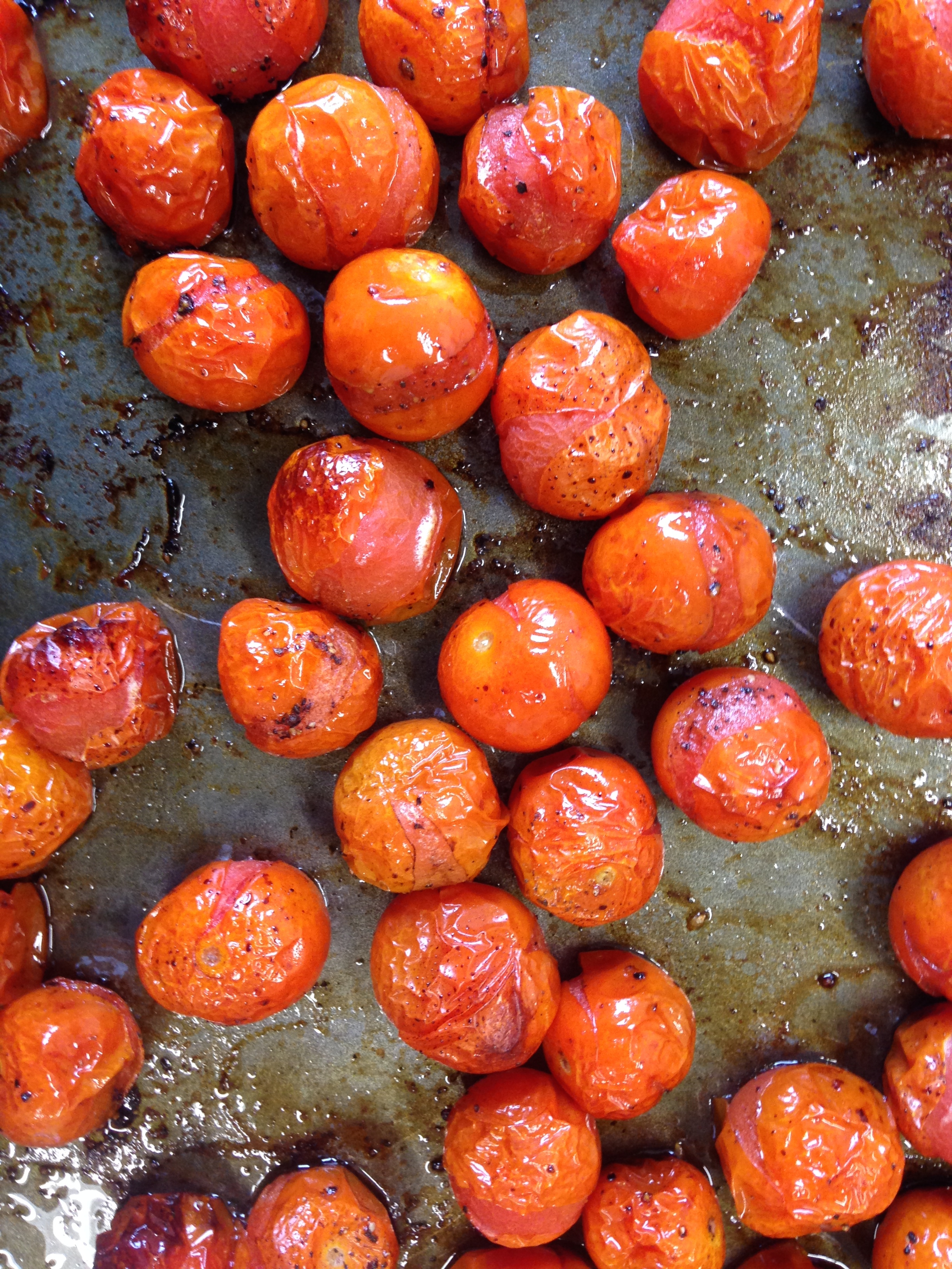 Preheat the oven to 170 degrees. Start by tipping out all of your tomatoes onto a baking tray and covering with a little olive oil, salt and pepper. Just before they go in, drizzle with a little bit of balsamic vinegar for extra flavour. The tomatoes should roast nicely for about 30 minutes but keep checking on them regularly to give them a shake and make sure they aren’t catching.