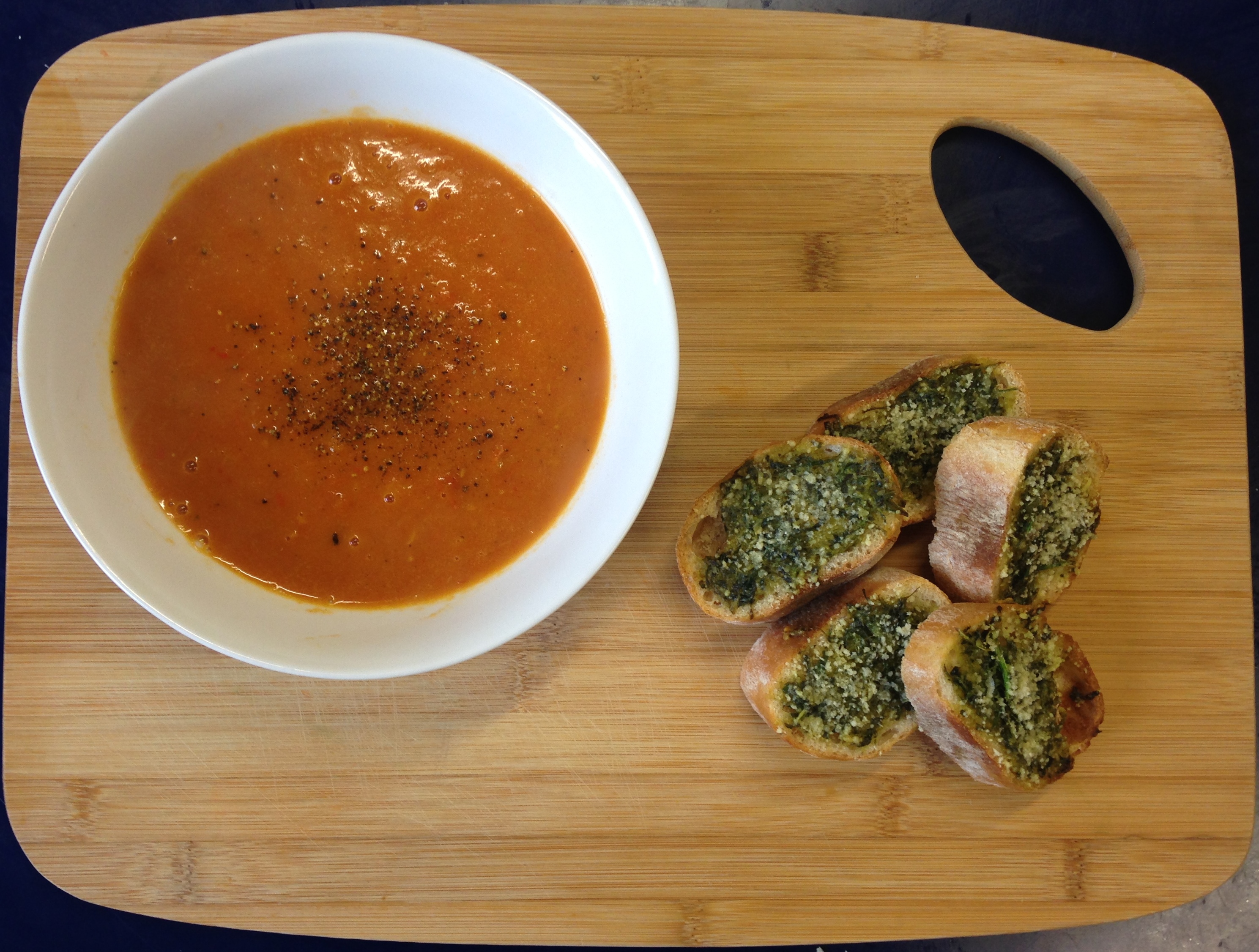 I’ve never made tomato soup before and I had a real craving for it yesterday morning, so I thought I would give it a go! I also decided to try and make it a little more interesting than just having ordinary bread by making some little pesto and parmesan toasts, with homemade garden herb pesto! I had loads of herbs in my fridge that were a little past their best, so I though this would be a good way to use them up instead of letting them go to waste! If you don’t fancy making the pesto, feel free to use ready made. You could even use chilli pesto or sun dried tomato for a nice deviation from the recipe.