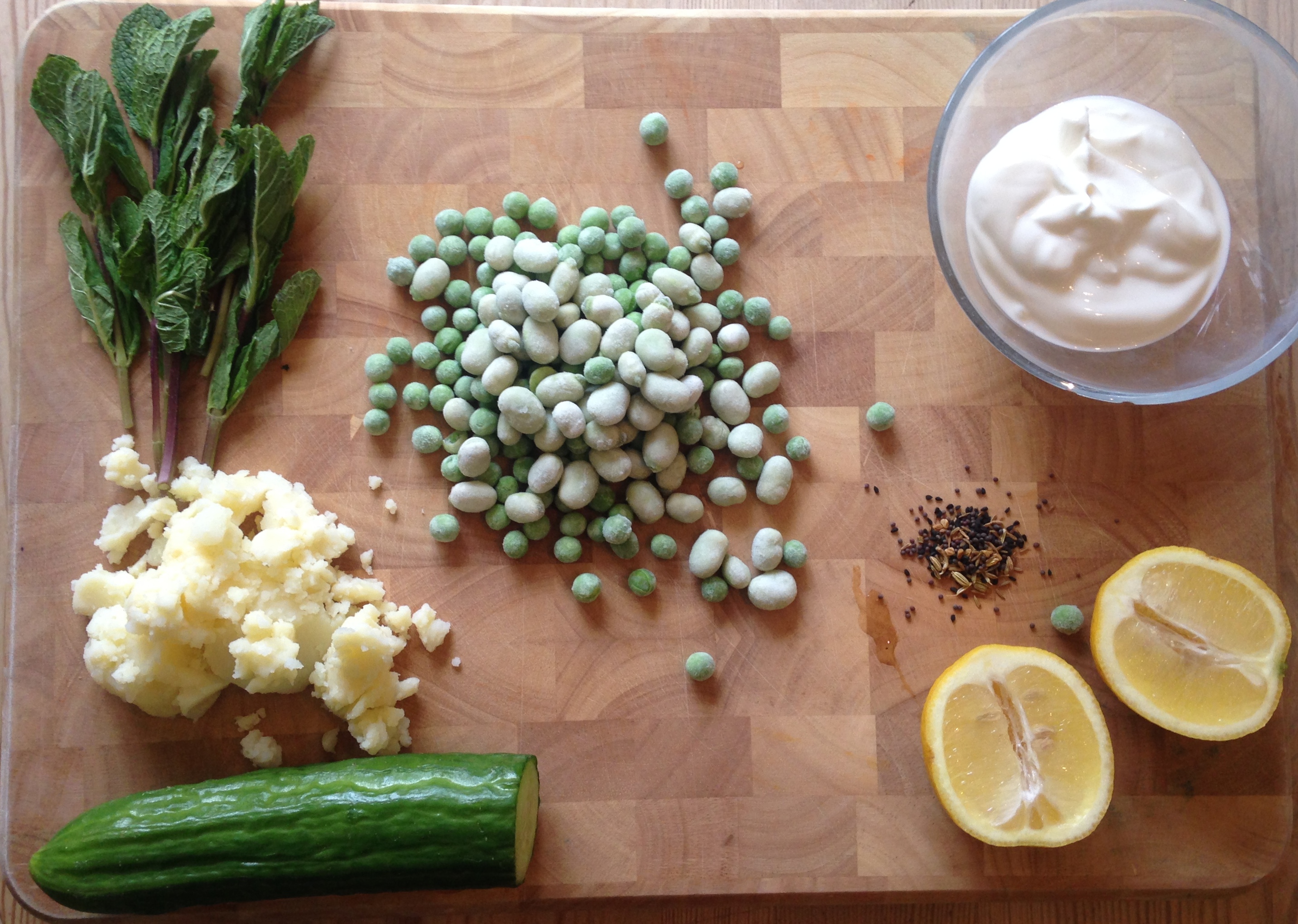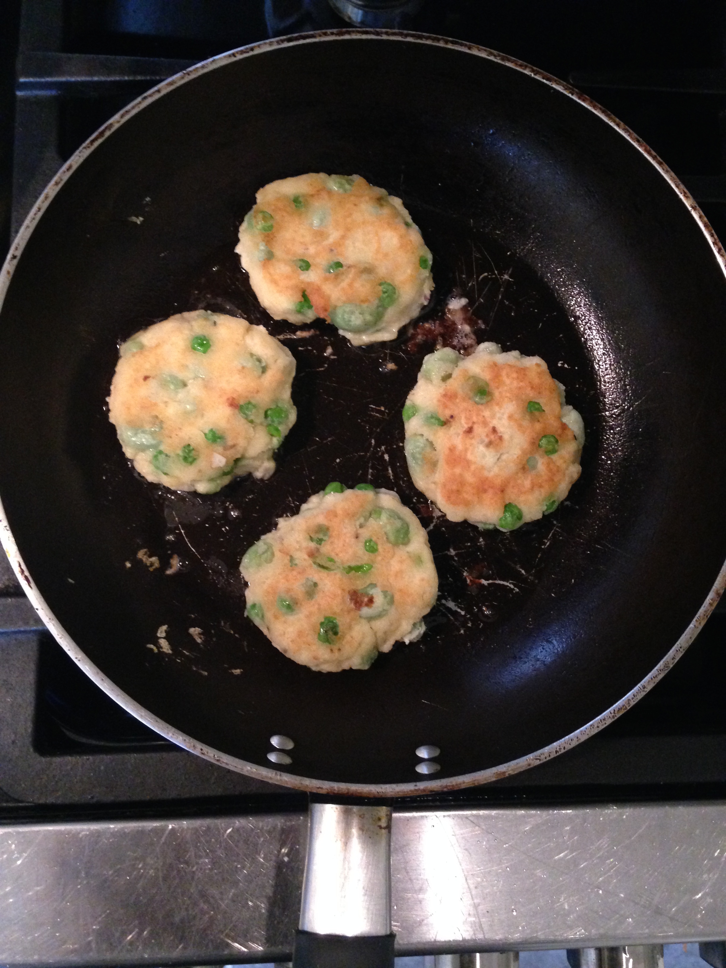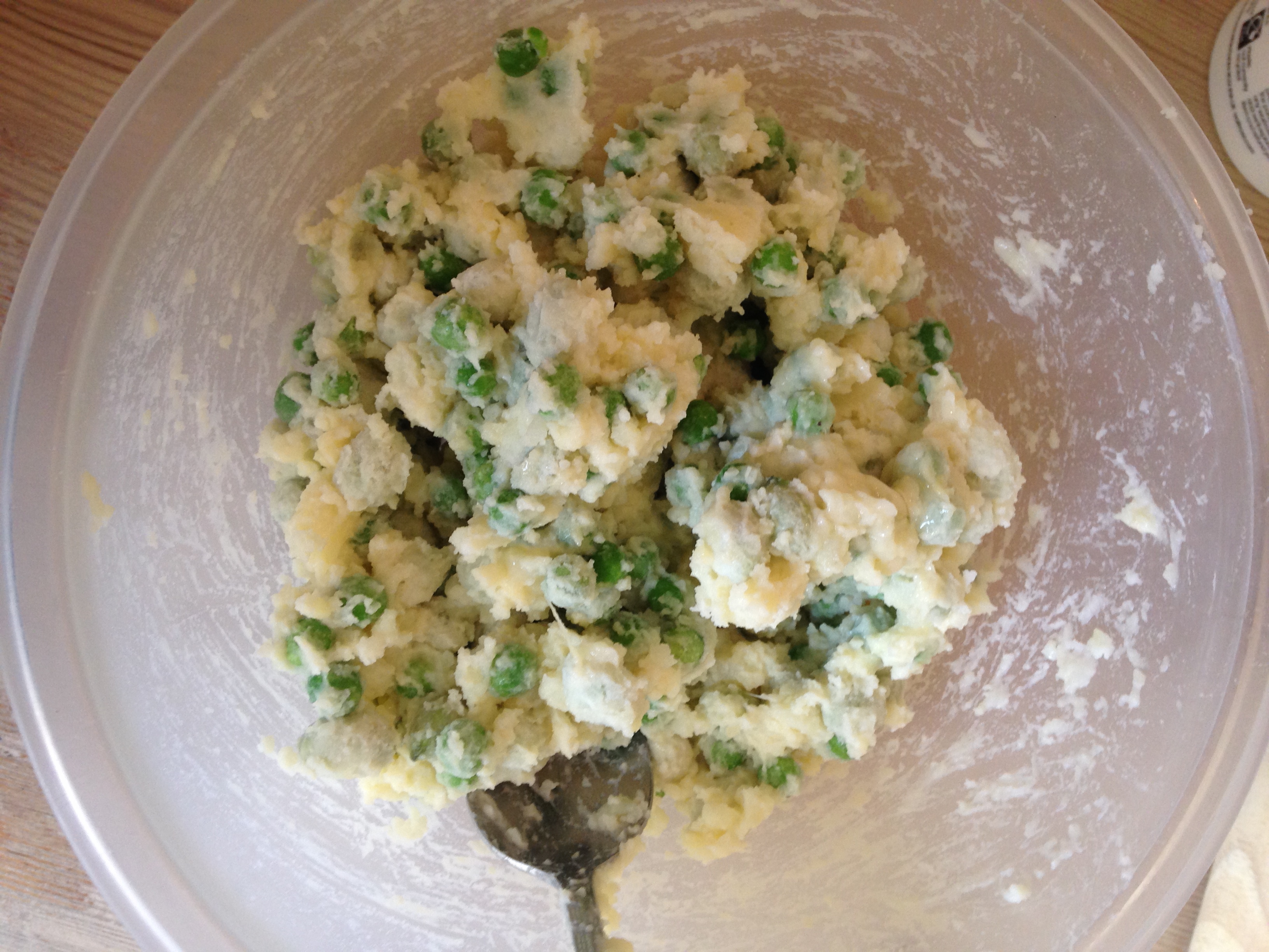 Put your potato, beans, peas, egg, spices and a pinch and salt and pepper into a bowl and mix well. Then add the flour and mix until a doughy texture that you are able to gently form into small balls. Cover your hands in flour and make walnut sized balls of mixture, then place onto a plate ready for frying.