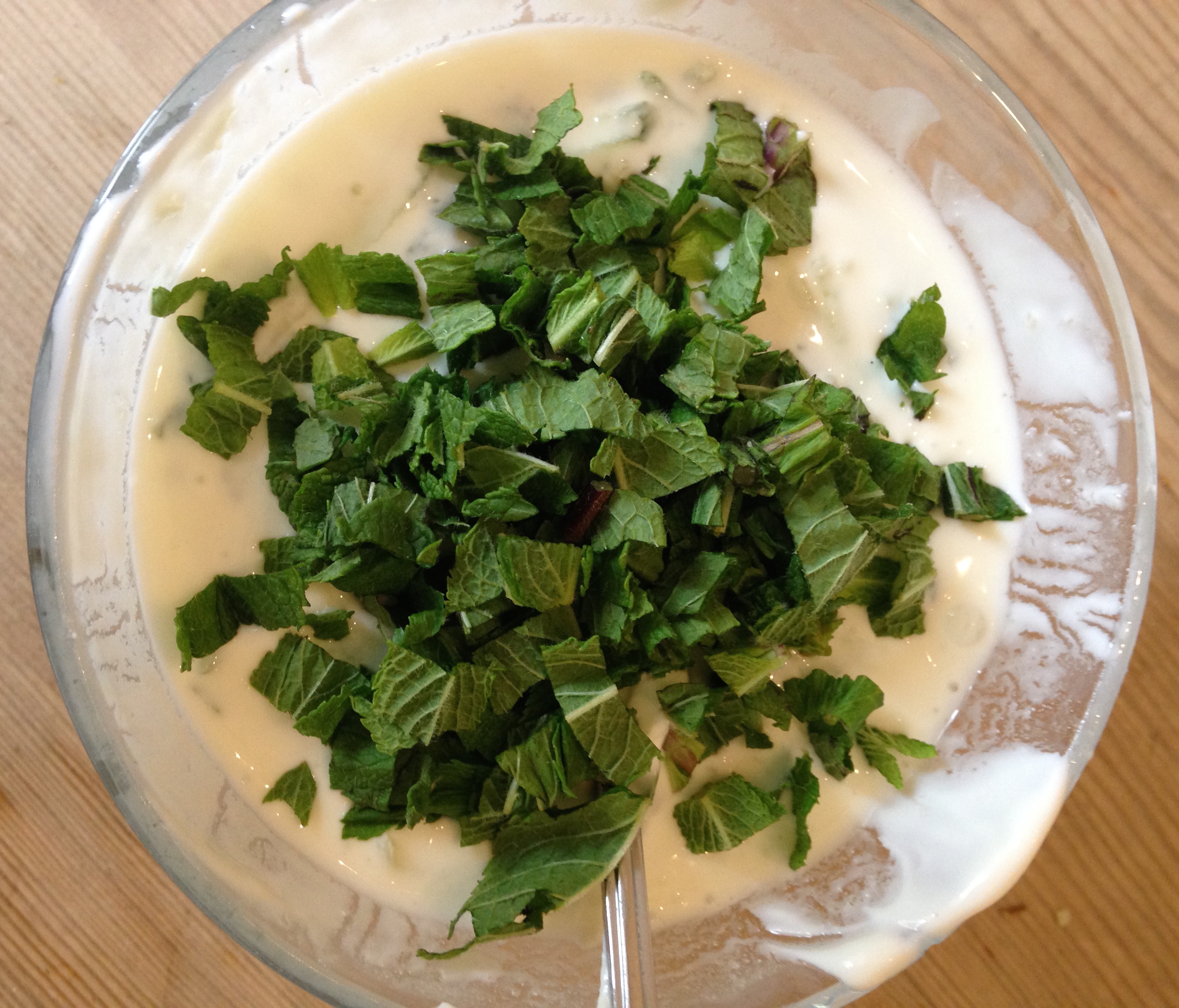 Now put the yoghurt into a bowl, squeeze in the lemon juice and add a little salt and mix. Grate the cucumber, squeeze out the excess liquid and add to the yoghurt. Roughly chop the mint and add to the bowl, stir until combined.