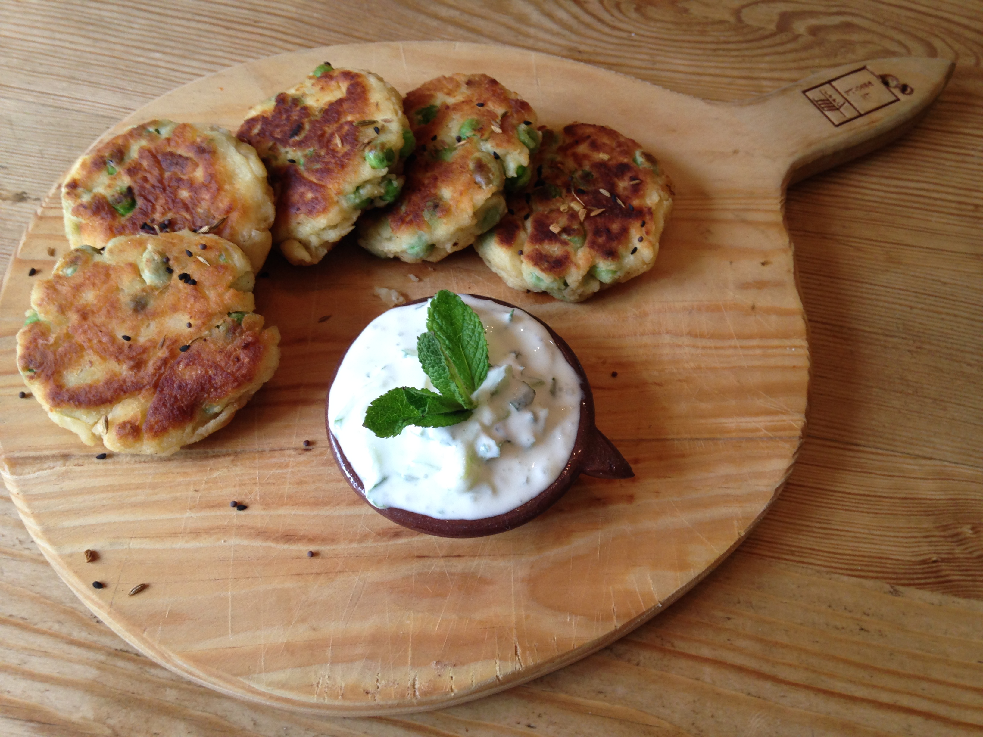 Put a frying pan on a medium heat and add 1 tablespoon of oil. Once the oil is hot, add three to four balls and fry for a few minutes on each side. Once the cakes are done, they should be golden brown on both sides and cooked all the way through. Serve with a little dish of the yoghurt and a sprinkling of the spice mix.