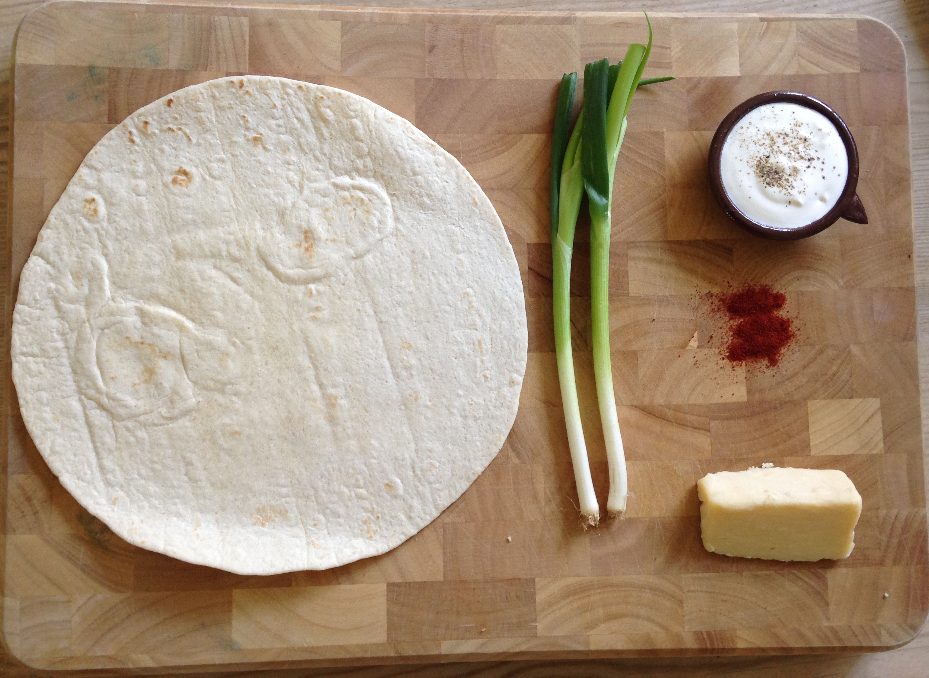 Place the wrap flat in the pan, pressing down lightly and quickly with your fingers. Leave it in the pan for 2 minutes until golden, then add a thin layer of the cheese and spring onions to half the wrap. Sprinkle on a pinch of salt, pepper and smoked paprika then fold over in the pan.