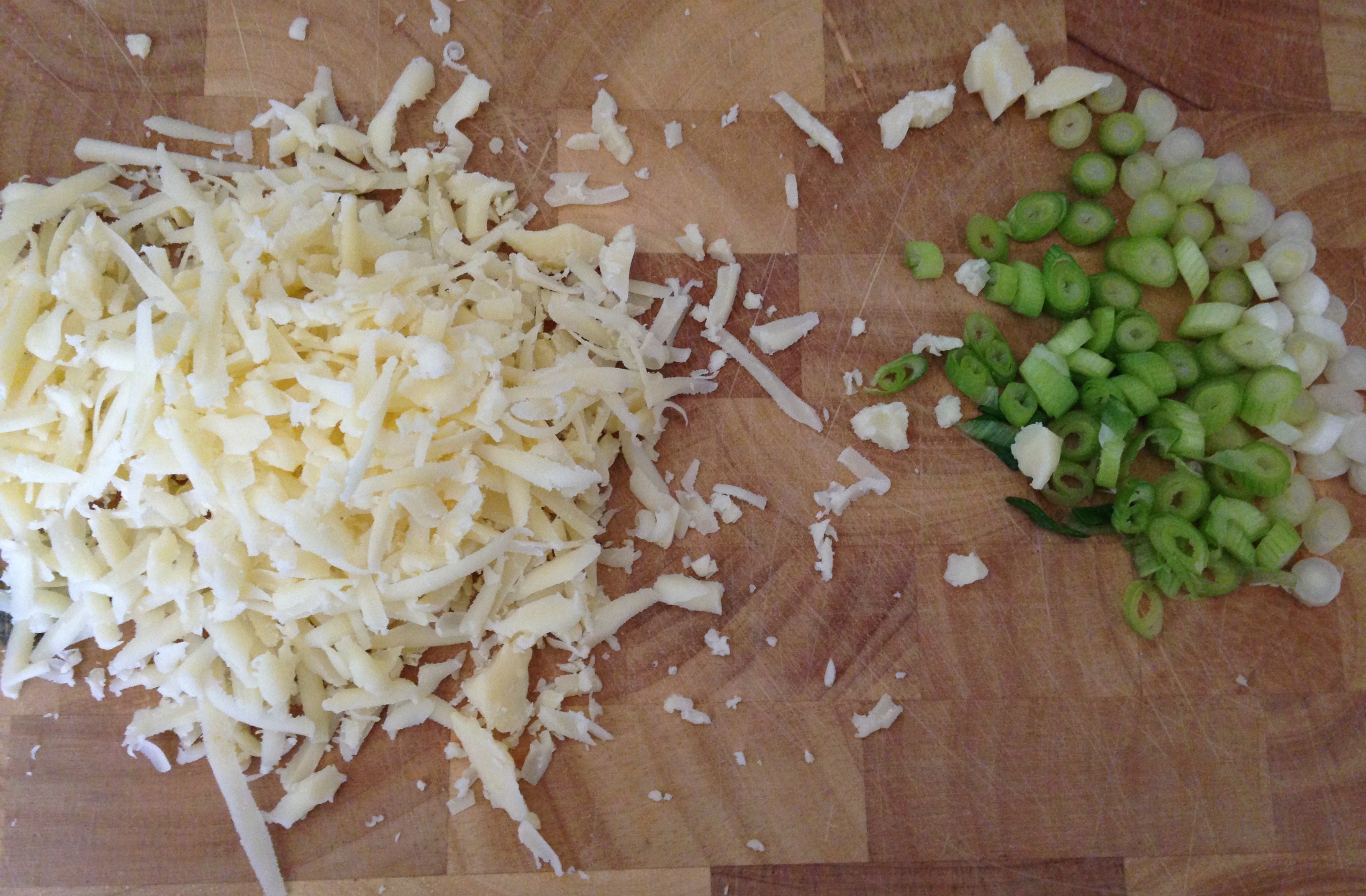 Finely slice the spring onions and grate the cheese (enough to thinly spread onto half a wrap, if cooking for one). Heat the butter up in a large or medium frying pan until bubbling.