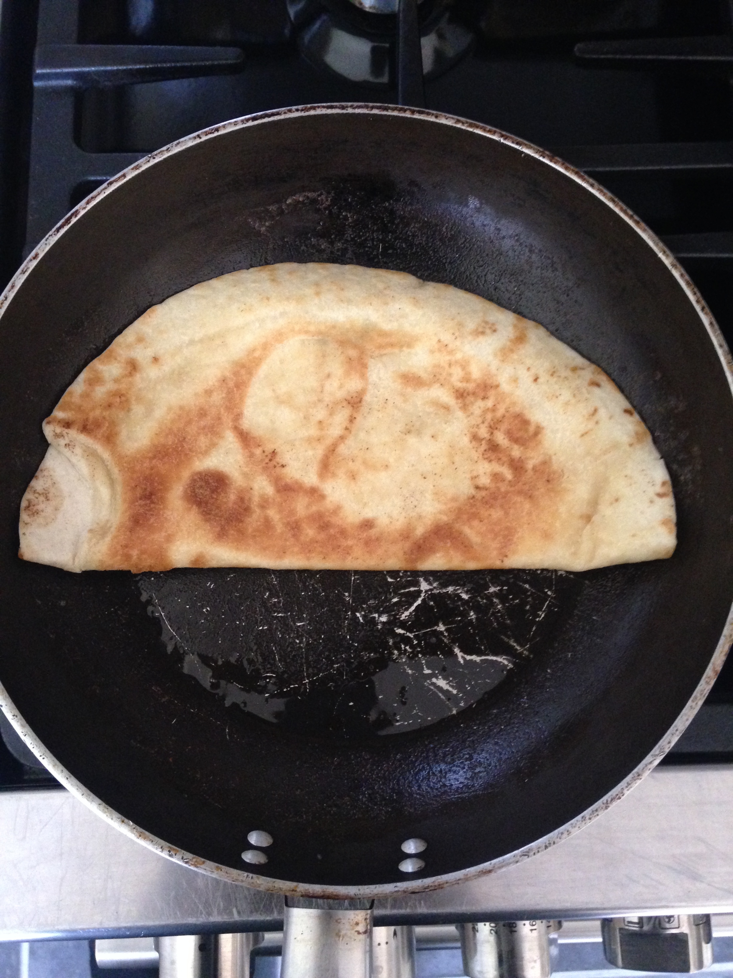 Turn the quesadilla for a few minutes each side, lifting up one side slightly to see if the cheese has completely melted inside. Once the cheese has melted and the outside of the quesadilla is golden brown, take the pan off the heat and cut the wrap in half.