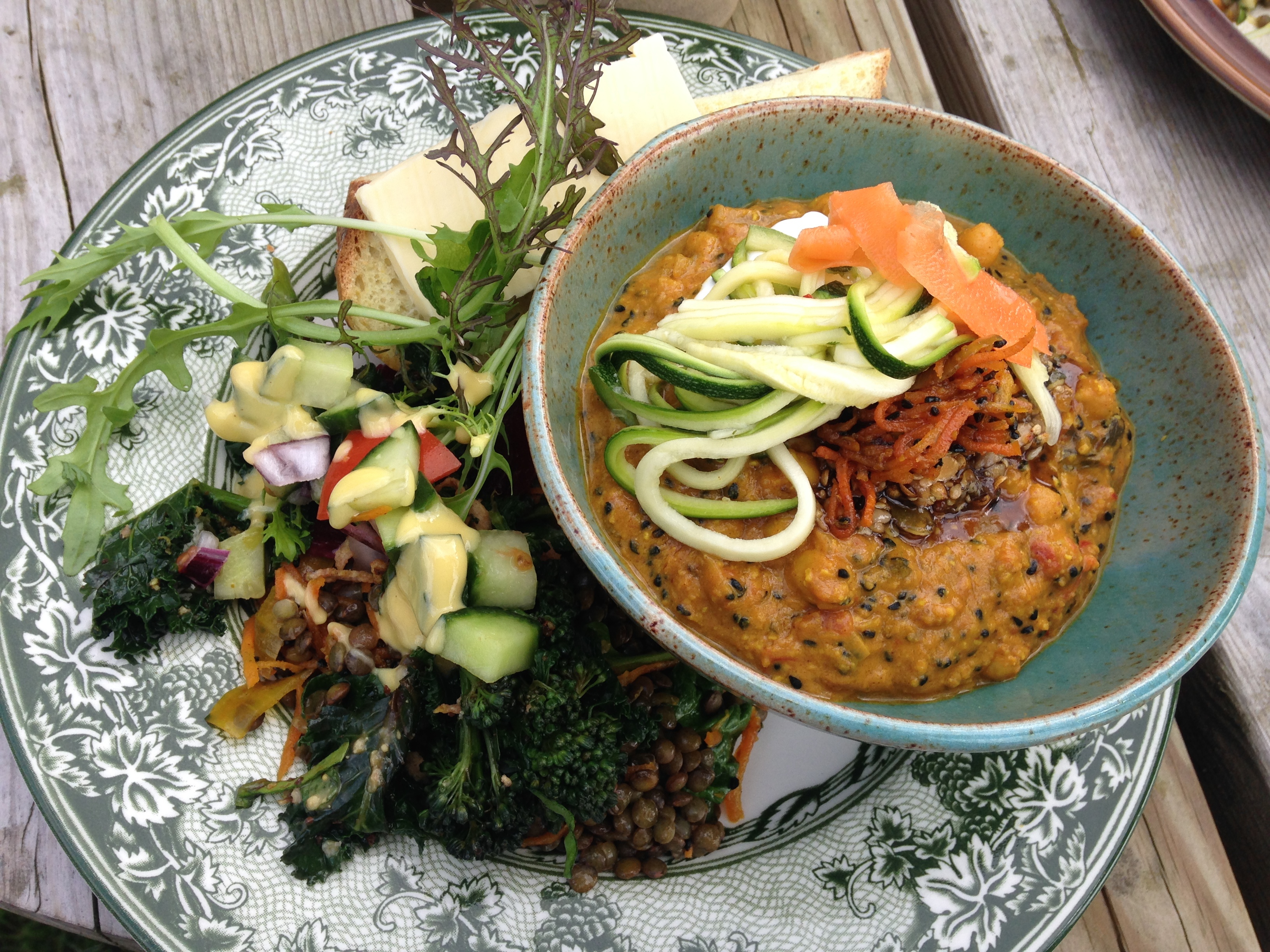 The chalkboard menus set out the delicious sounding dishes, as well as drinks, teas and coffees. I went for the chickpea, coconut and almond dhal with a luscombe lemonade. The dhal was served with a lentil and kale salad with some mixed veg and a lovely dressing, as well as a good sized piece of homemade corn bread and butter. The dhal was one of the best I have ever tasted, the flavours were incredible and I was very impressed. The salad was a great addition, and I love corn bread so I was already sold on that front!
