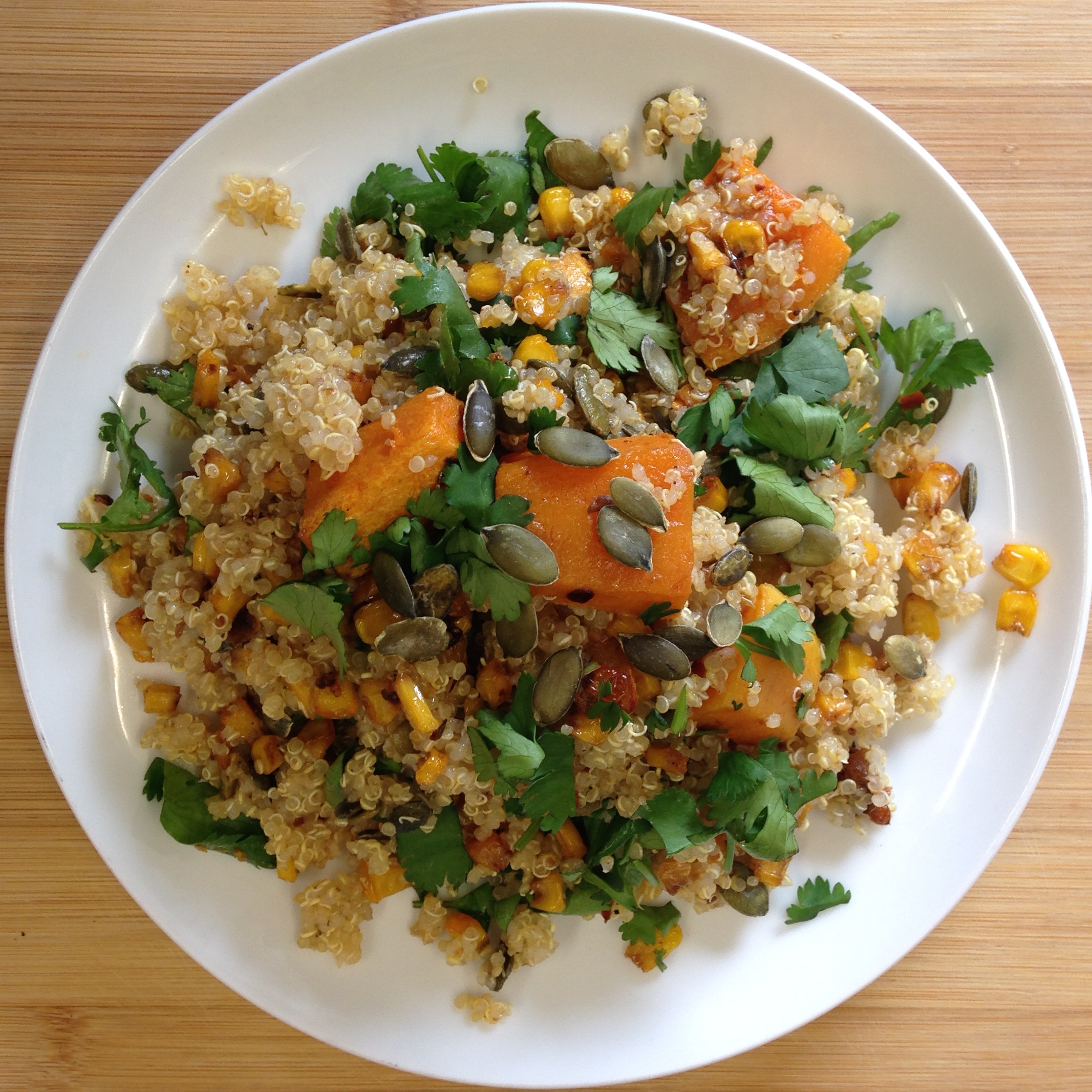 Heat the oven to 200 degrees, then place the squash and corn on a baking tray and roast in the oven for 30 minutes. While the veg is cooking, cook the quinoa according to packet instructions. Chop the coriander roughly and set aside.