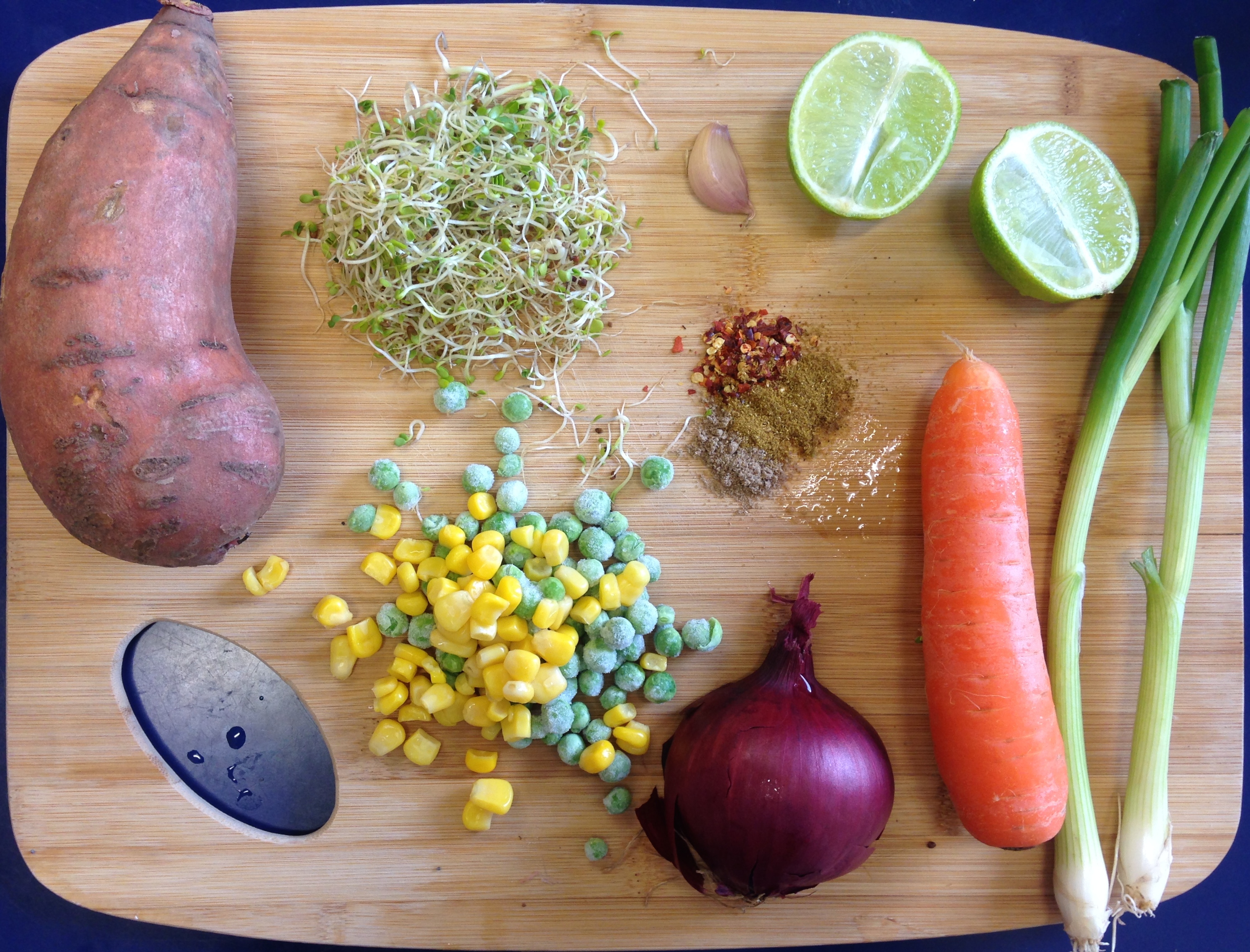 It’s been quite some time since I’ve written a post due to exam craziness so I thought I’d make something to reward myself and ease myself back into cooking. It’s really easy to get into a funk when you’re doing exams, eating rubbish, getting out of practice with cooking and eating out way too much (I’ve certainly done all three) but this meal is a great way to celebrate cooking and eating your own food again. This also made a refreshing change from all the junk I had been eating, whilst still tasting like a treat meal. There is loads veg packed into this recipe: carrot, sweet potato, peas, sweetcorn and beansprouts. All really good for you as well as completely delicious! I added a few extra things that aren’t on my usual ingredients board to, but I just got inspiration as I went along cooking so I recommend you experiment and do this too, you never know you might make something delicious!