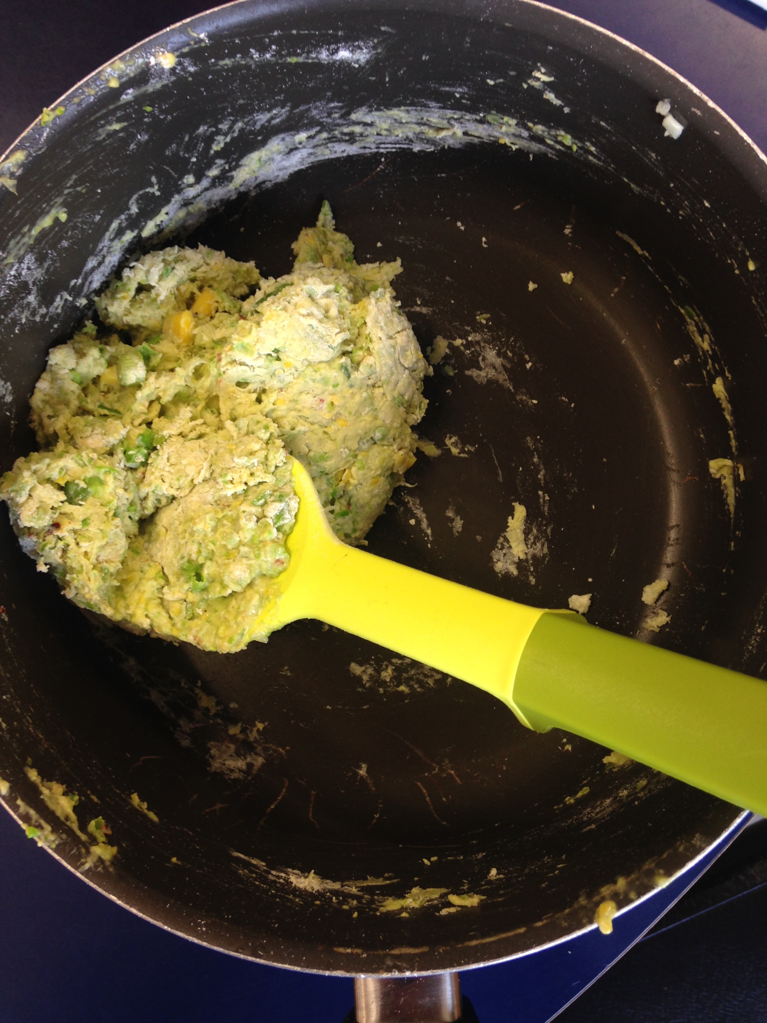 Wash and chop your sweet potato into fry-shaped pieces, then put on a baking tray with a drizzle of olive oil, salt and pepper. Put into the oven at 180 degrees for 25 minutes. Chop the spring onions and garlic and add to a large bowl or saucepan. Then add the peas and sweetcorn and spices and the juice of half a lime. Use a hand held blender (or a food processor, whatever you have!) to blend up until it forms a paste like consistency, then add the flour and mix with a spoon or spatula until a doughy texture.