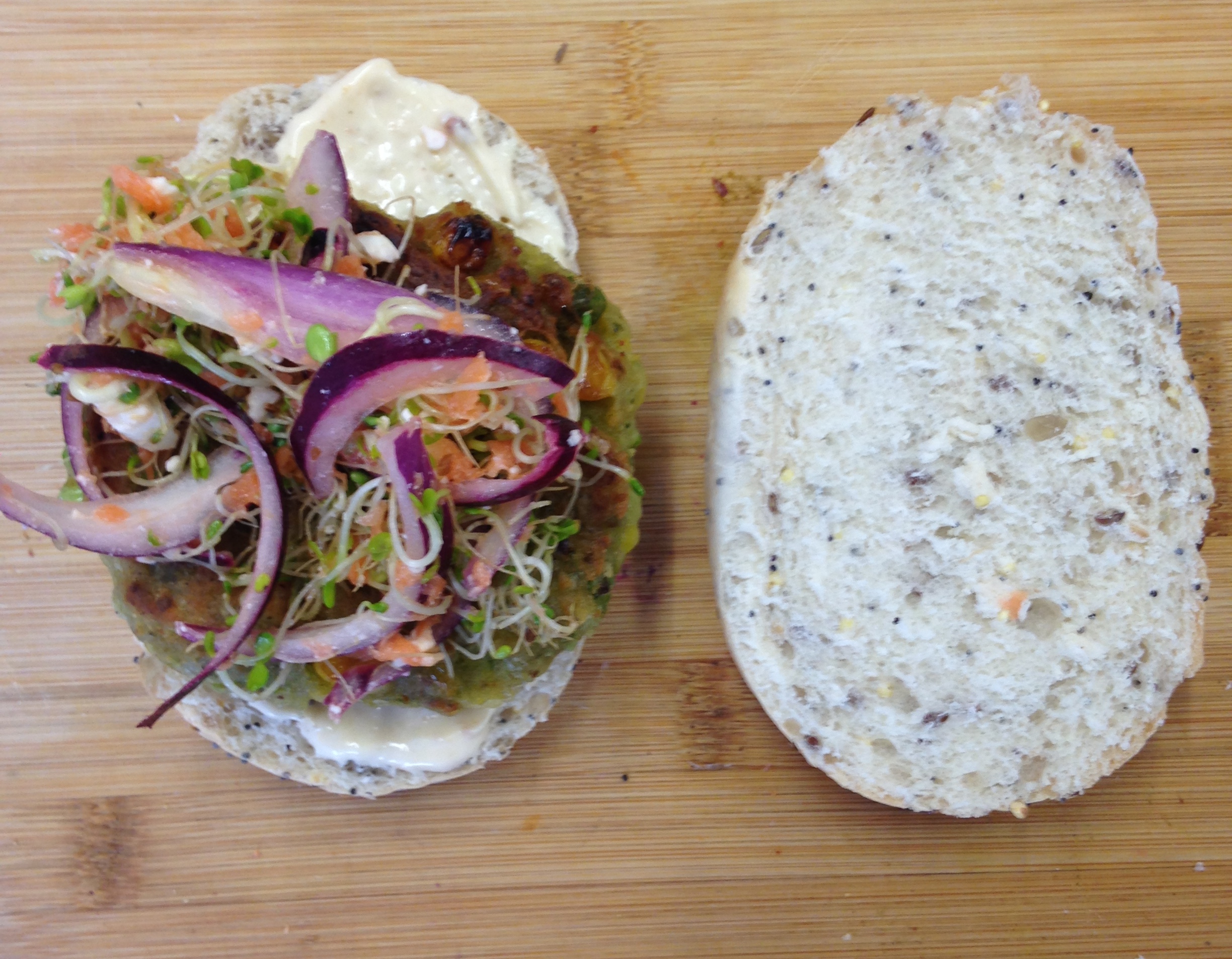 Flour your hands and form medium sized burgers and set aside. This mixture should make 2 or 3 burgers, so you’ll have some tasty leftovers too! Heat 1 tablespoon of olive oil in a frying pan on a high heat, once the oil is hot add the burgers to the pan. Turn when golden on once side and continue cooking, turning regularly for 10 minutes.