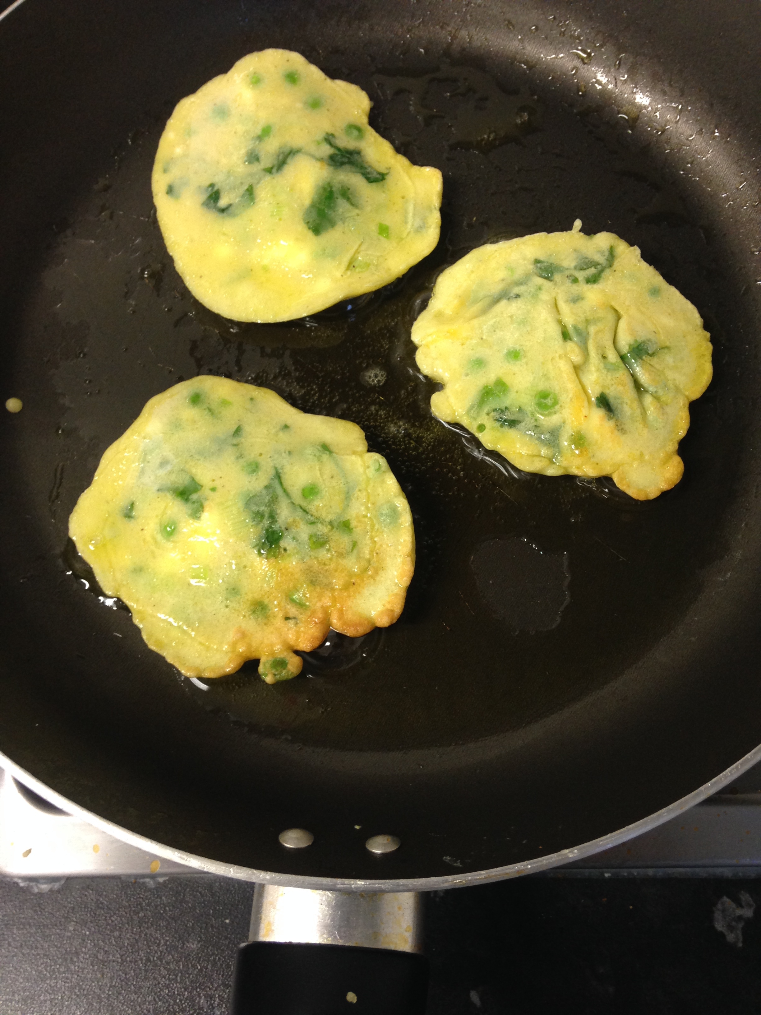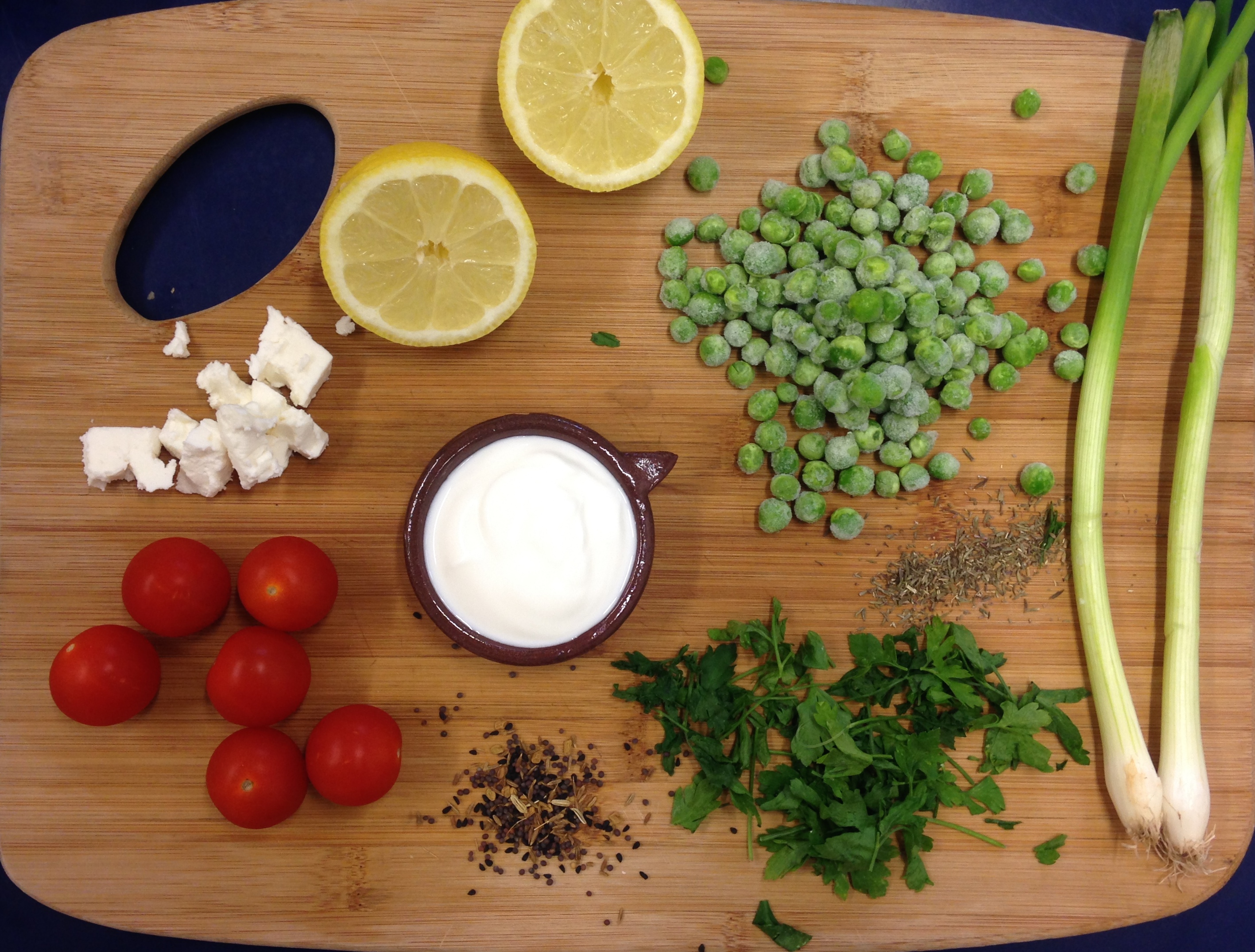 Put the peas into a large bowl or saucepan, then crumble in the feta. Finely slice the onions and add these too along with salt and pepper. Then crack in two eggs and whisk in the flour 1 tablespoon at a time. The mixture should be runny, but not watery. Let the mixture sit for a while and quarter your tomatoes.