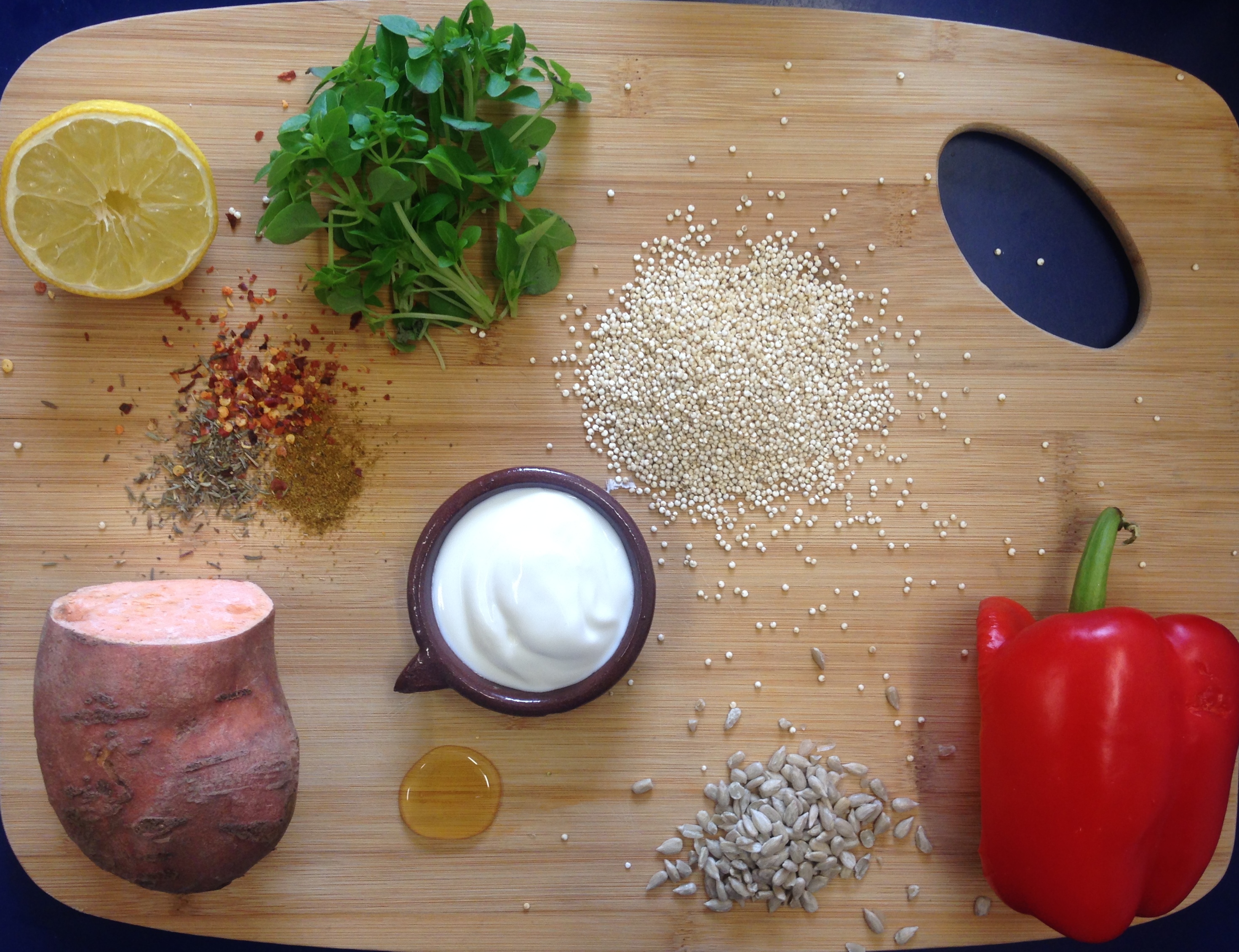 Peel and chop your sweet potato, then just cover with water in a small saucepan and put on a high heat for 20 minutes. At the same time, measure out 35g of quinoa and put with 5 parts water in a saucepan on a high heat also. Both pans should cook the contents within 30 minutes. The quinoa is ready when all the water has gone from the pan, the sweet potato is ready when you are able to stick a knife all the way through with ease.