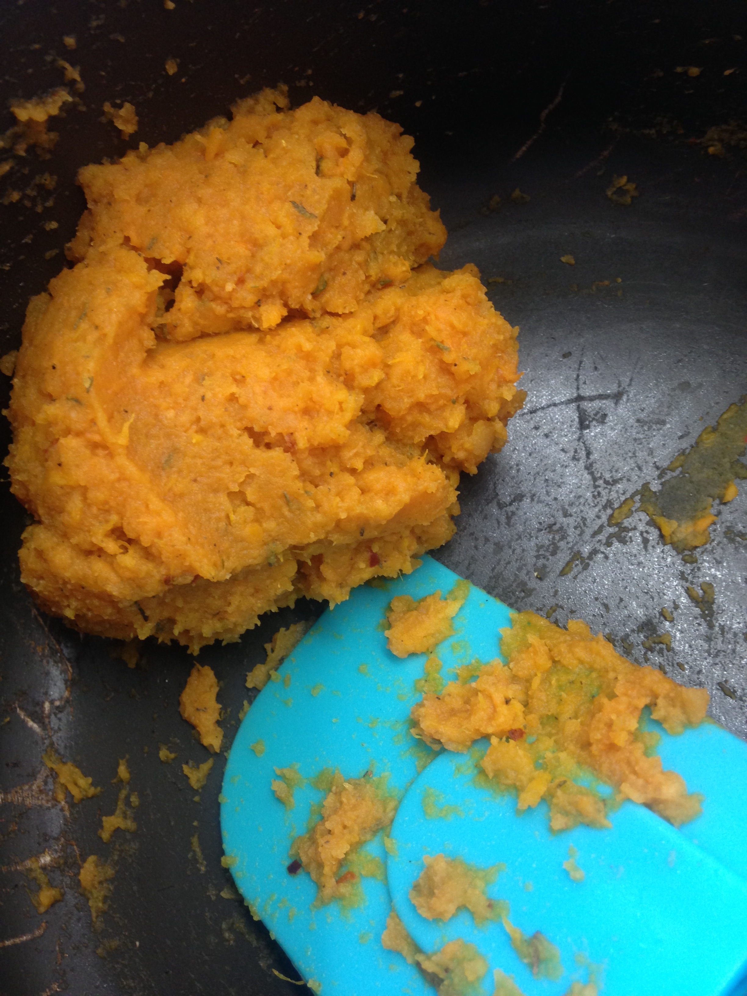 When the sweet potato is cooked, drain and put into a saucepan and mash until smooth. Add the garam masala, thyme and chilli flakes to the mash along with salt and pepper, mix thoroughly.