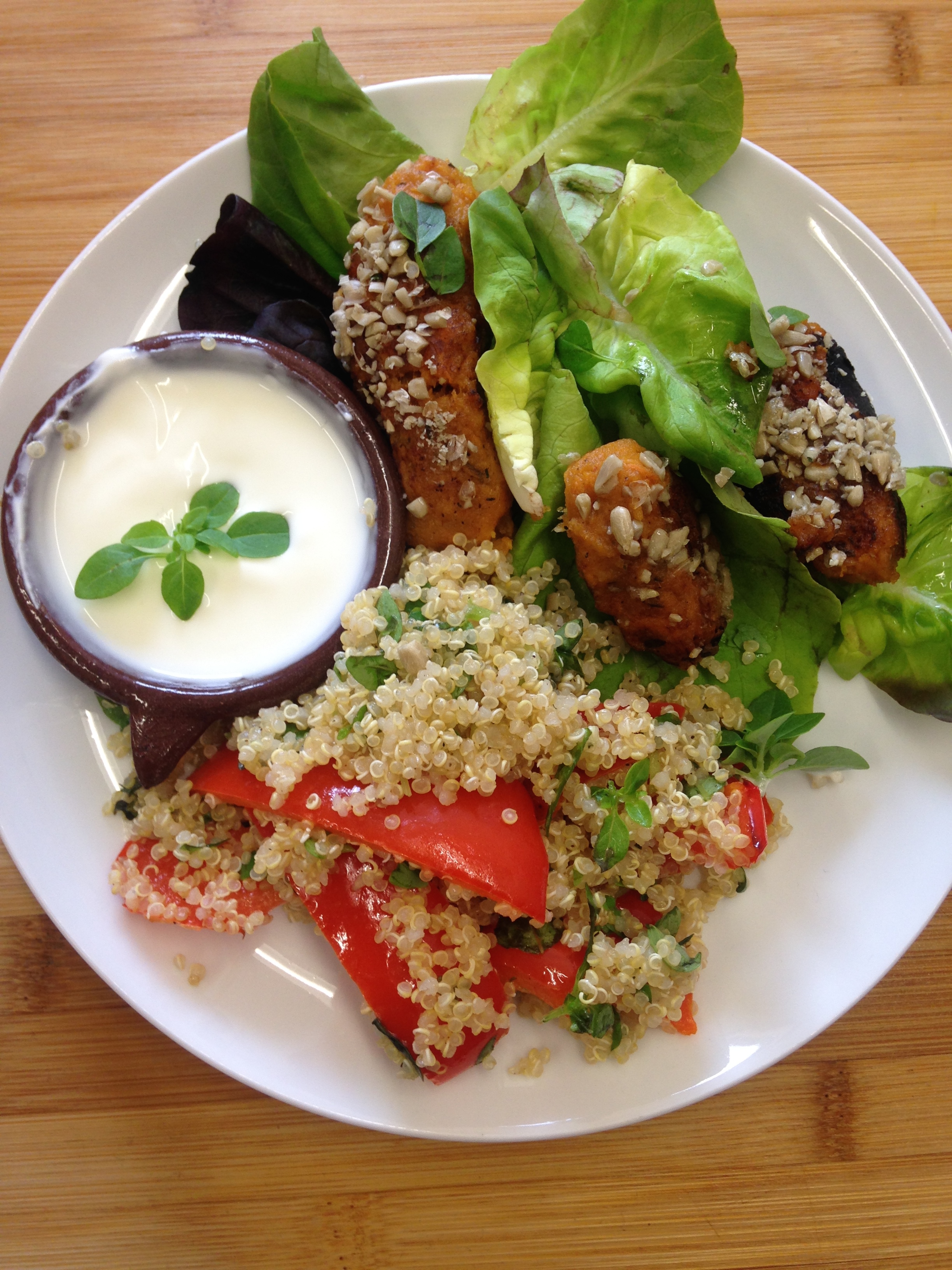 Once the peppers are done, transfer all to a plate with a bed of lettuce on it. Mix the peppers into the quinoa and serve with yoghurt! This is really tasty and healthy, perfect for a summer lunch and can also be easily made for a crowd!