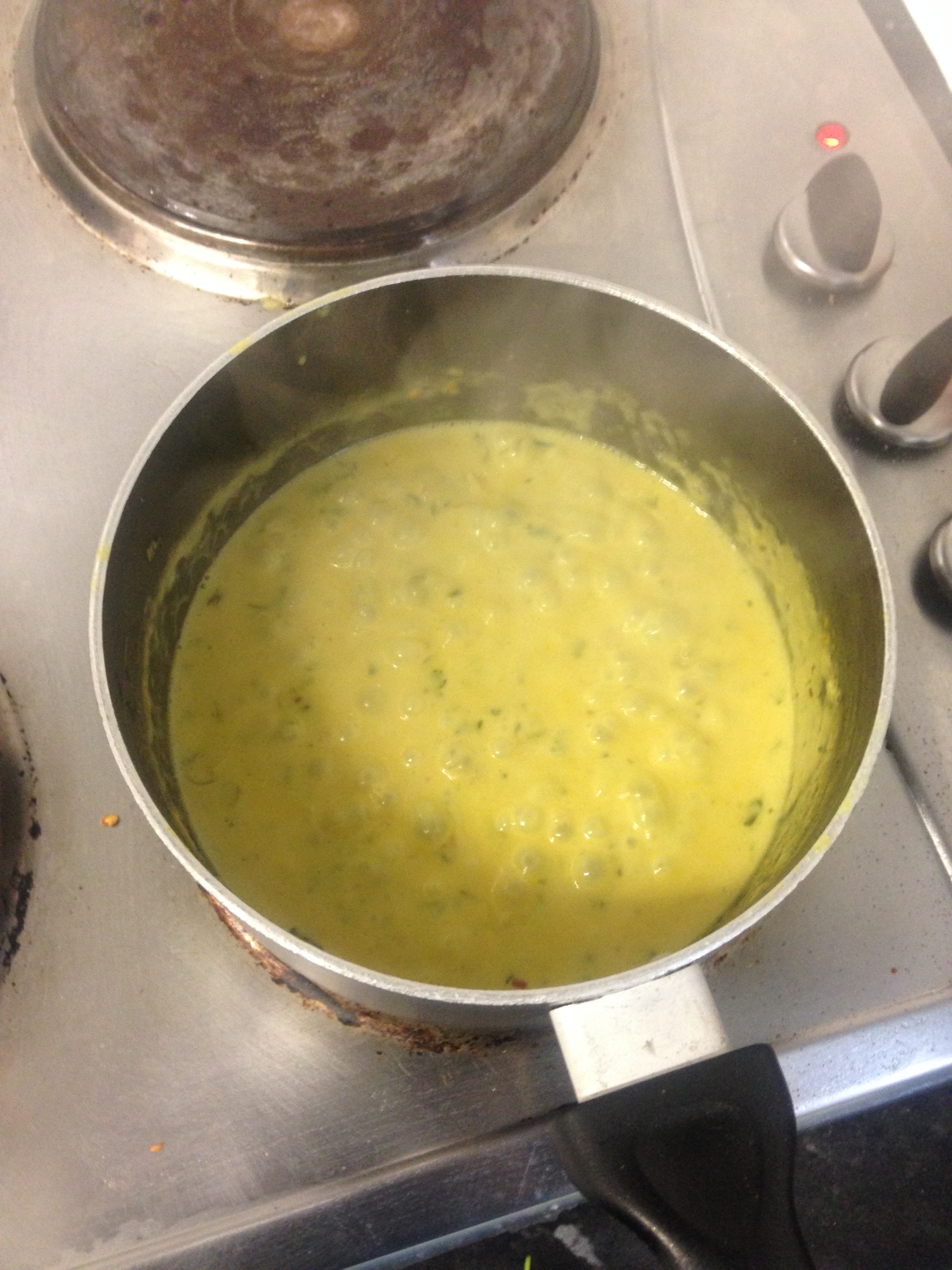 Then open the can of coconut milk and add 250ml to the pan. Add the turmeric for a little colour. Turn the heat down and simmer for 15 minutes. Take the squash out of the oven.