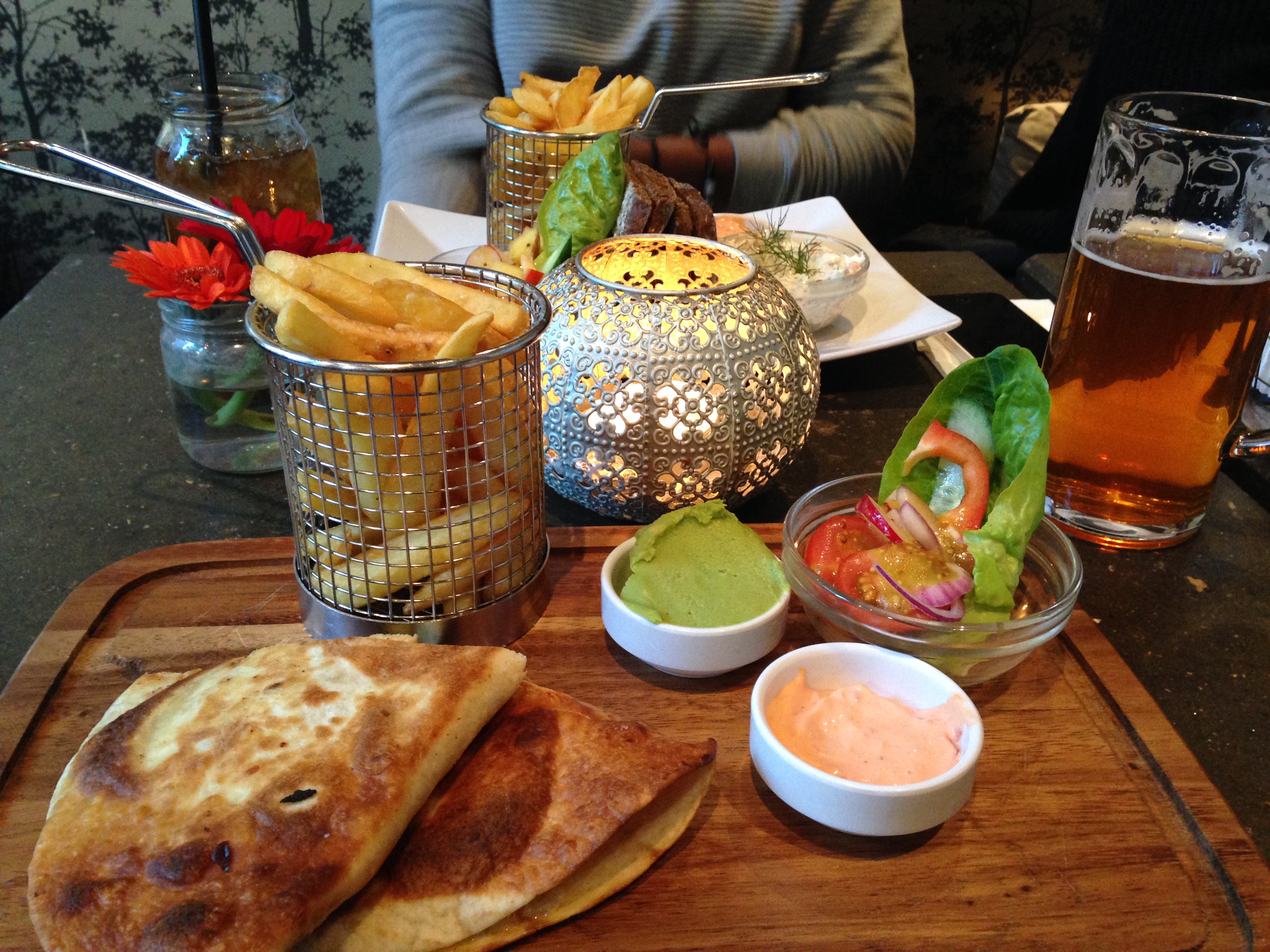 I ordered the spinach and feta quesadilla and after a slight mix up with a chicken version, it tasted delicious. The sides were also surprisingly good, I particularly enjoyed the crunchy salad, as usually these elements aren’t given much thought. Overall, really good gastro-pub style food in a cosy yet elegant setting.