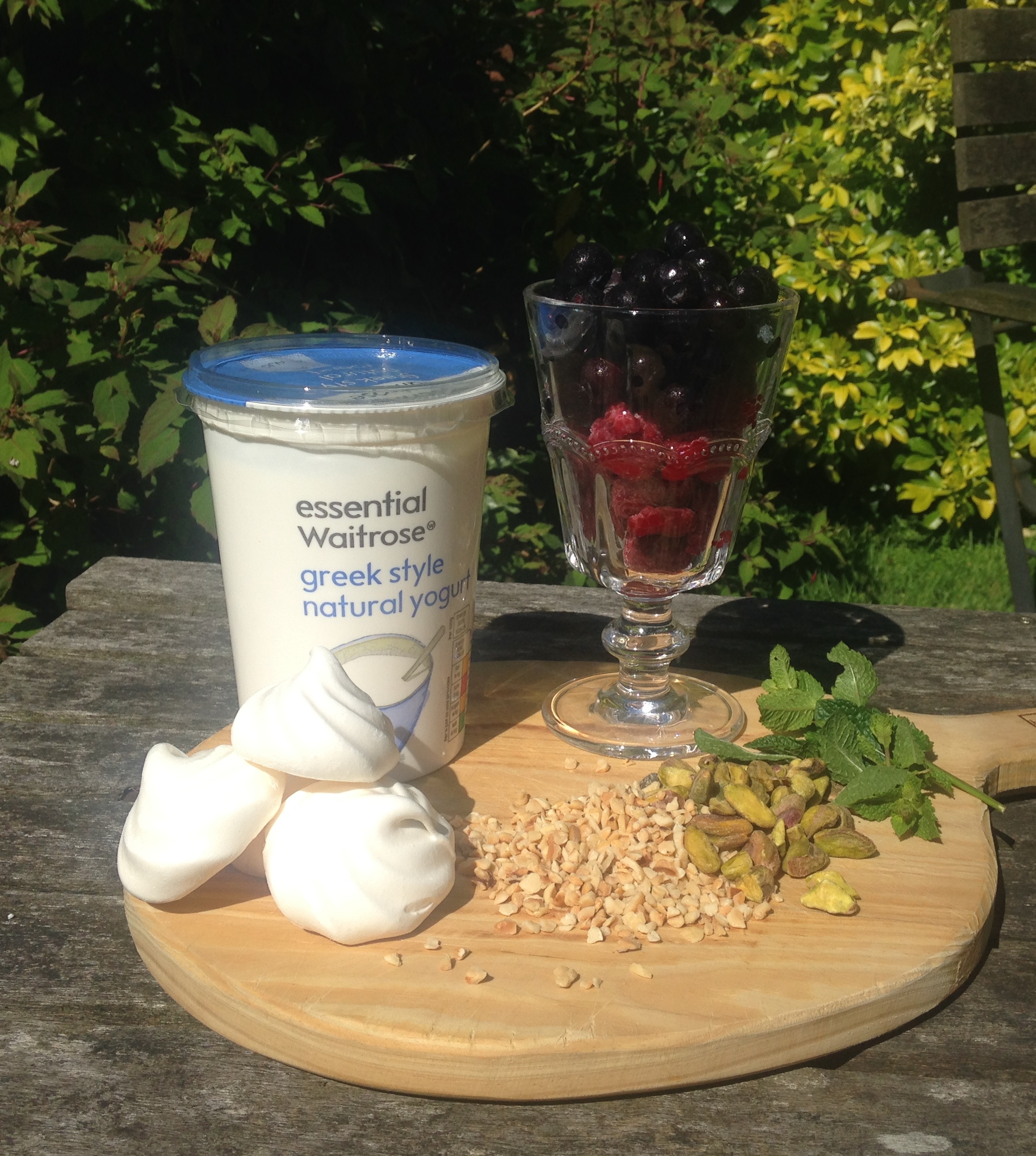 Apologies for the little break in posting, it’s been a pretty busy summer so far! The sunny weather today inspired me to make this beachy, summer berry ripple sundae, perfect for BBQs. I’ve used thick, Greek yoghurt and frozen berries for a fresh take on a traditional ice cream sundae! I really love the mix of textures in this dessert, the meringue, nuts, yoghurt and pureed berries create a wonderful pudding that can be served in jam jars, sundae glasses or even ordinary drinking glasses if you’re short on glassware!