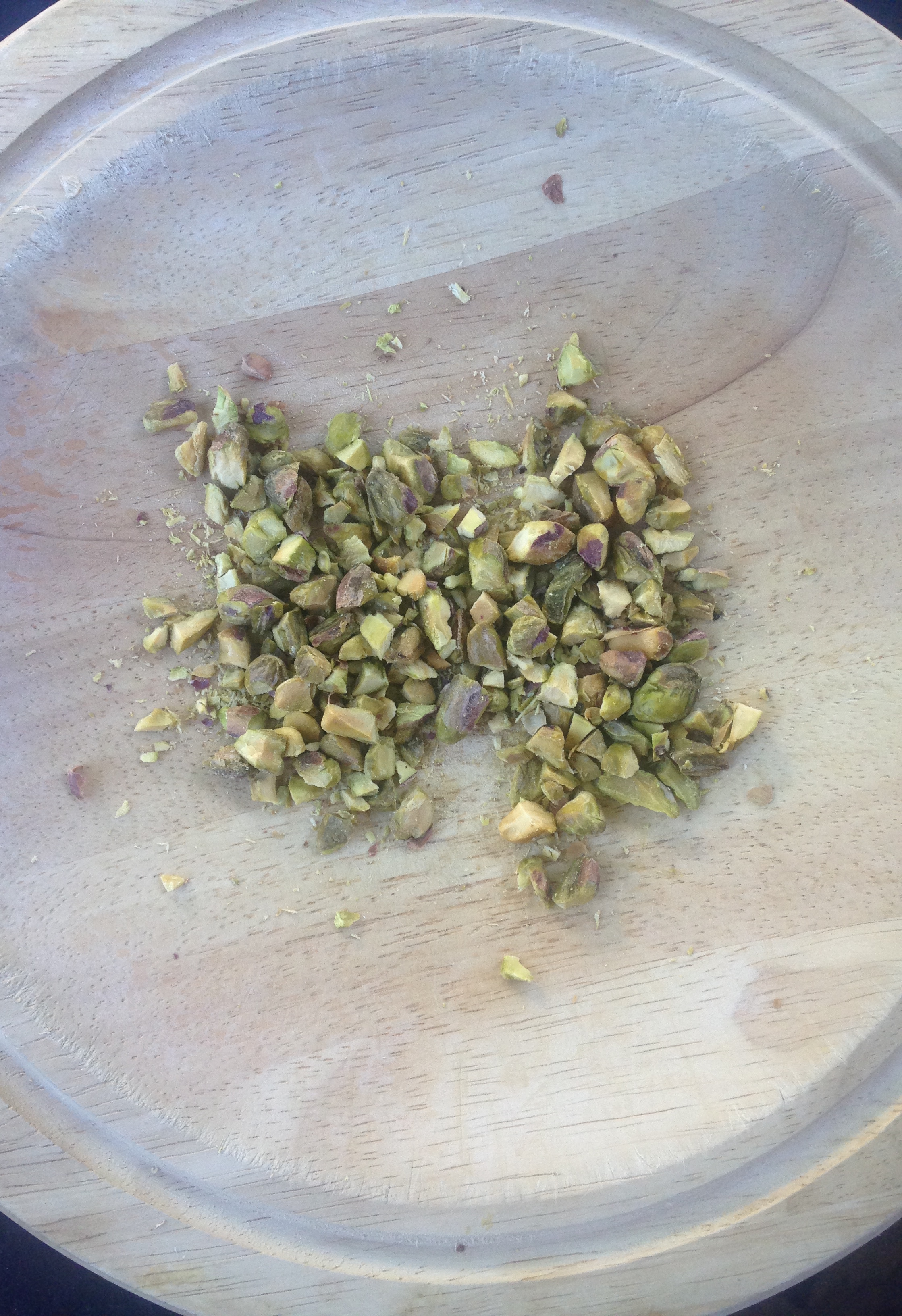 Crush the meringues roughly in your hands and place into a bowl while you prepare the rest of the ingredients. Chop the hazelnuts and pistachios, make sure you buy the shelled ones to save you alot of time and your fingernails!