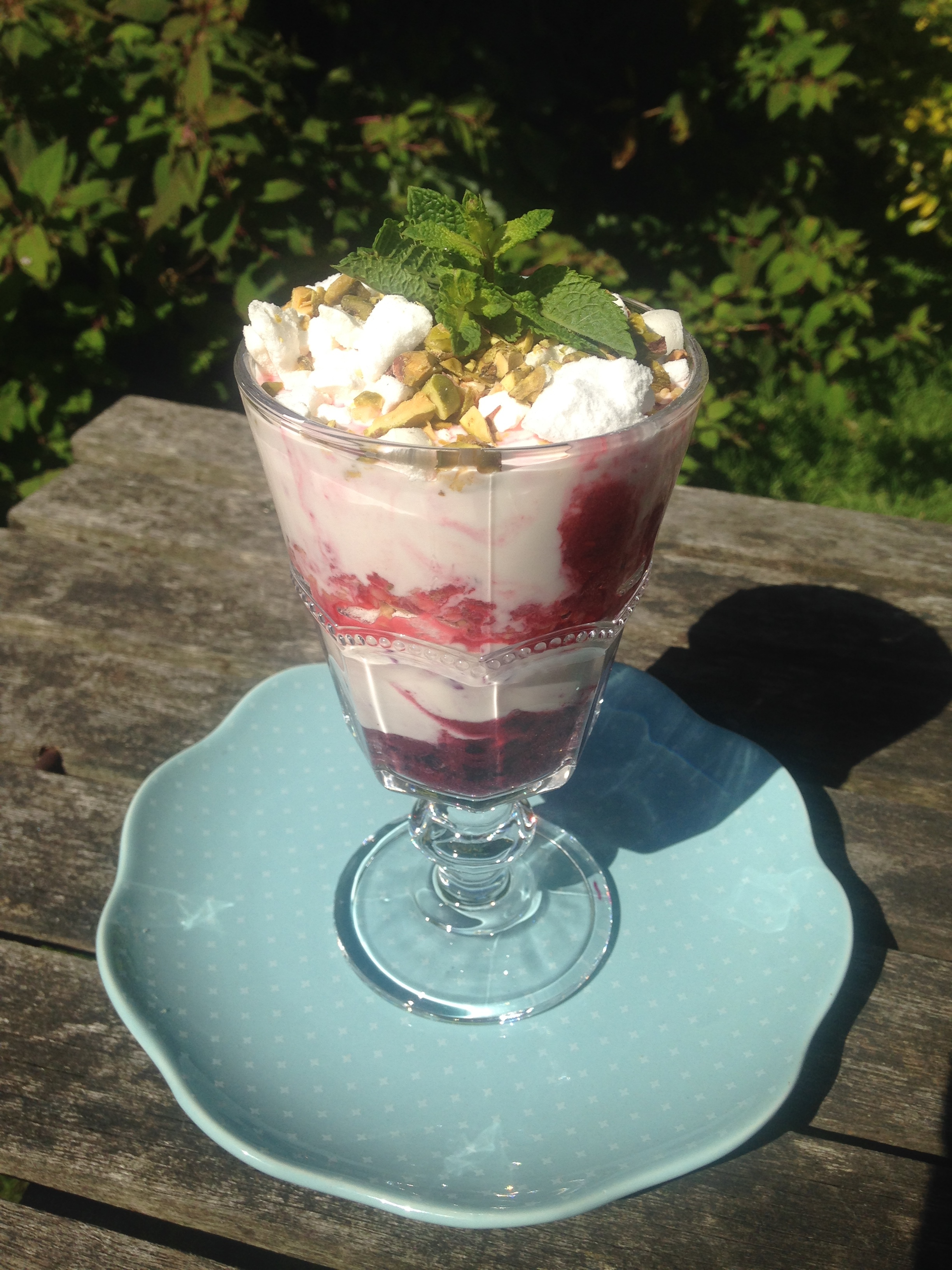 Add a layer of meringue, then a layer of nuts, followed by the yoghurt and then the pureed raspberries. Top with a little more yoghurt, meringue and nuts. Garnish with a few mint leaves and enjoy!