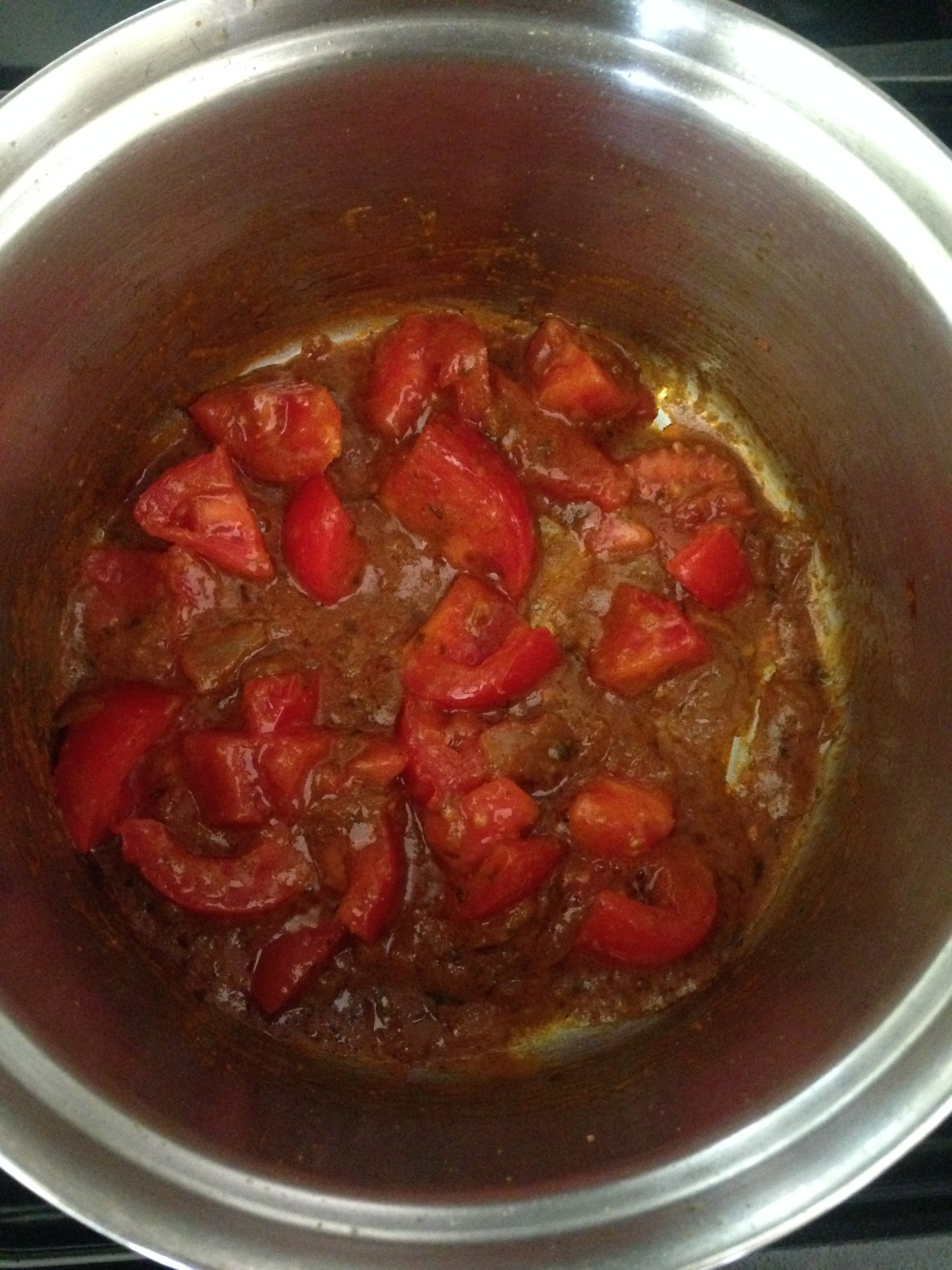 Put a tablespoon of oil into a small saucepan on a medium heat, add the tikka paste to the pan and stir for a few minutes. Then roughly chop and add the tomato. Simmer for 5 minutes.