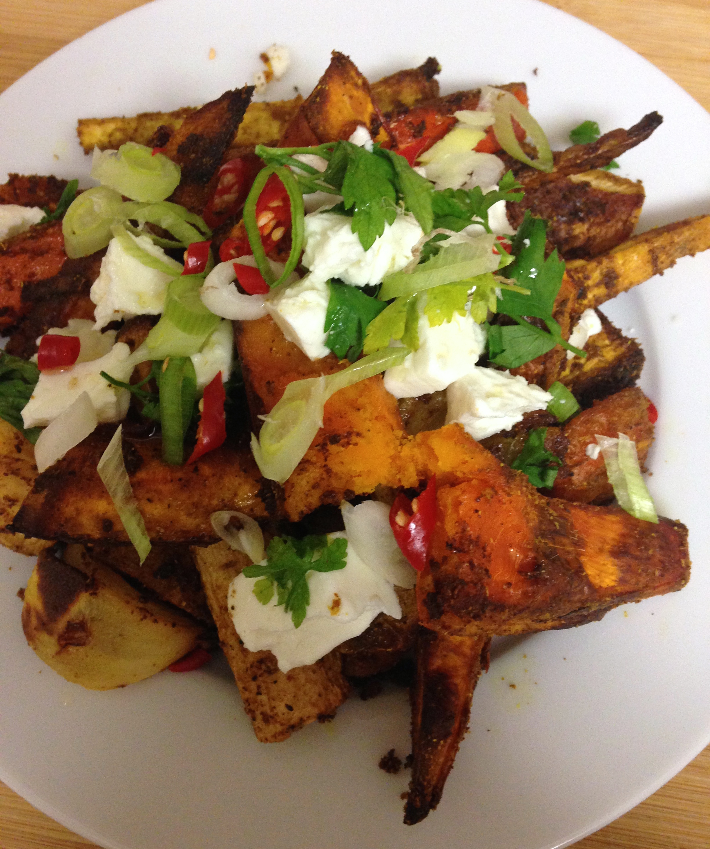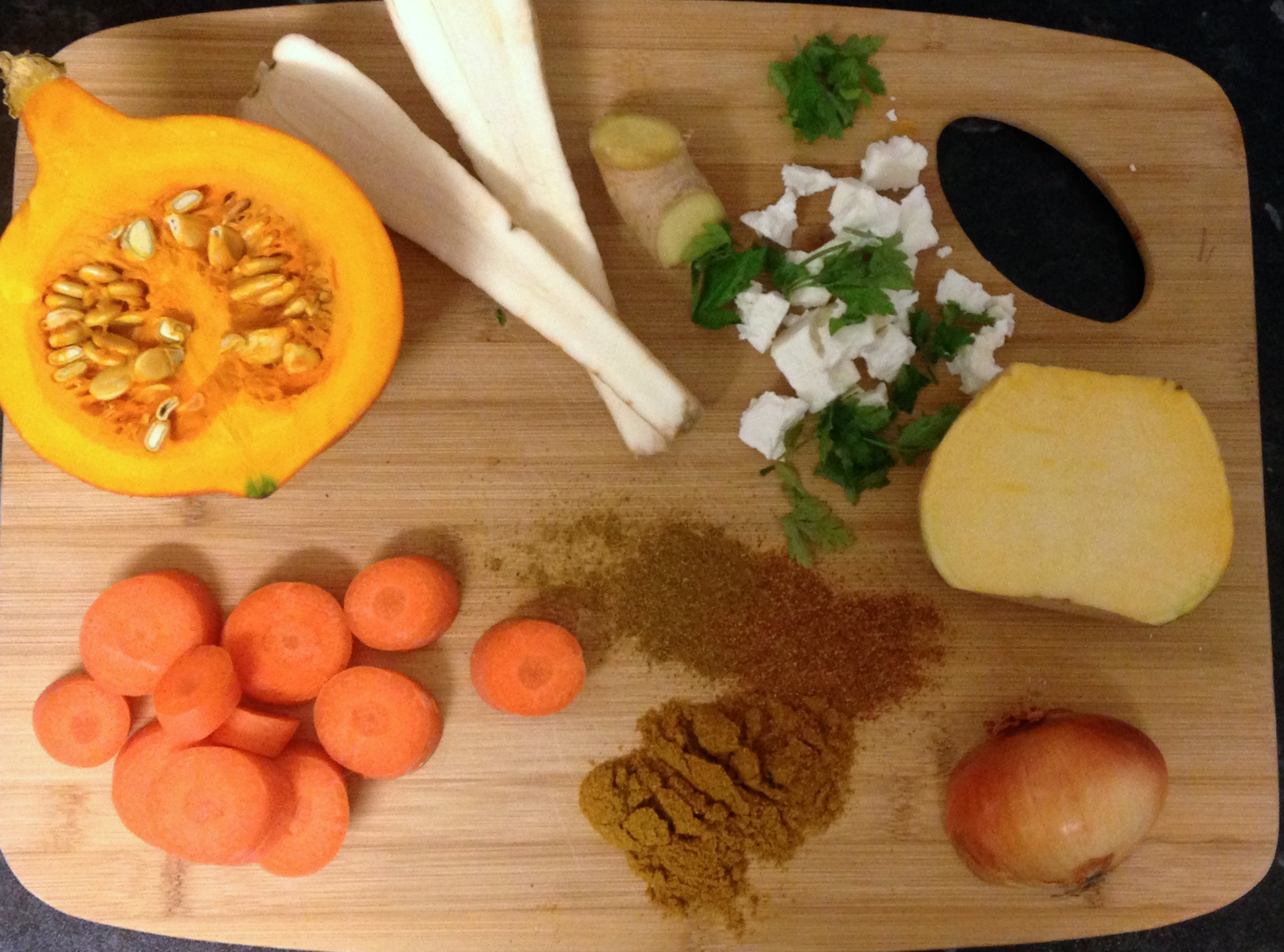 It’s the perfect season at the moment for winter veg like squash, swede and parsnip. One of my favourite ways to have these tasty veg is curried in a salad or, once roasted, whizzed up into a chunky soup with yoghurt and bread. The robust curry flavours work so well against mild flavoured root veg, lightened up with a little feta, fresh chillis and spring onions. This really does make a delicious winter salad or perfect side dish for a lentil dahl.