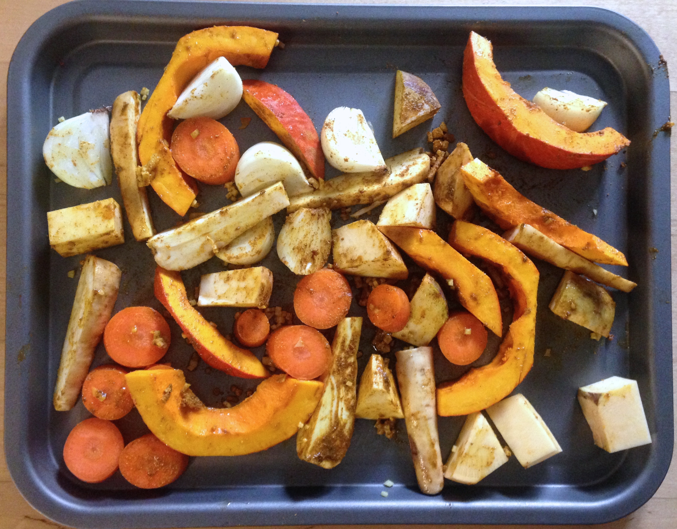Preheat the oven to 180 degrees. Chop all the veg into 1-2cm chunks, apart from the squash, leaving the skin on. I find this gives the veg a more nutty, tasty flavour when roasted. Sprinkle over the spices and season with salt and pepper. Rub into the veg with plenty of olive oil and place in the oven on a tray.