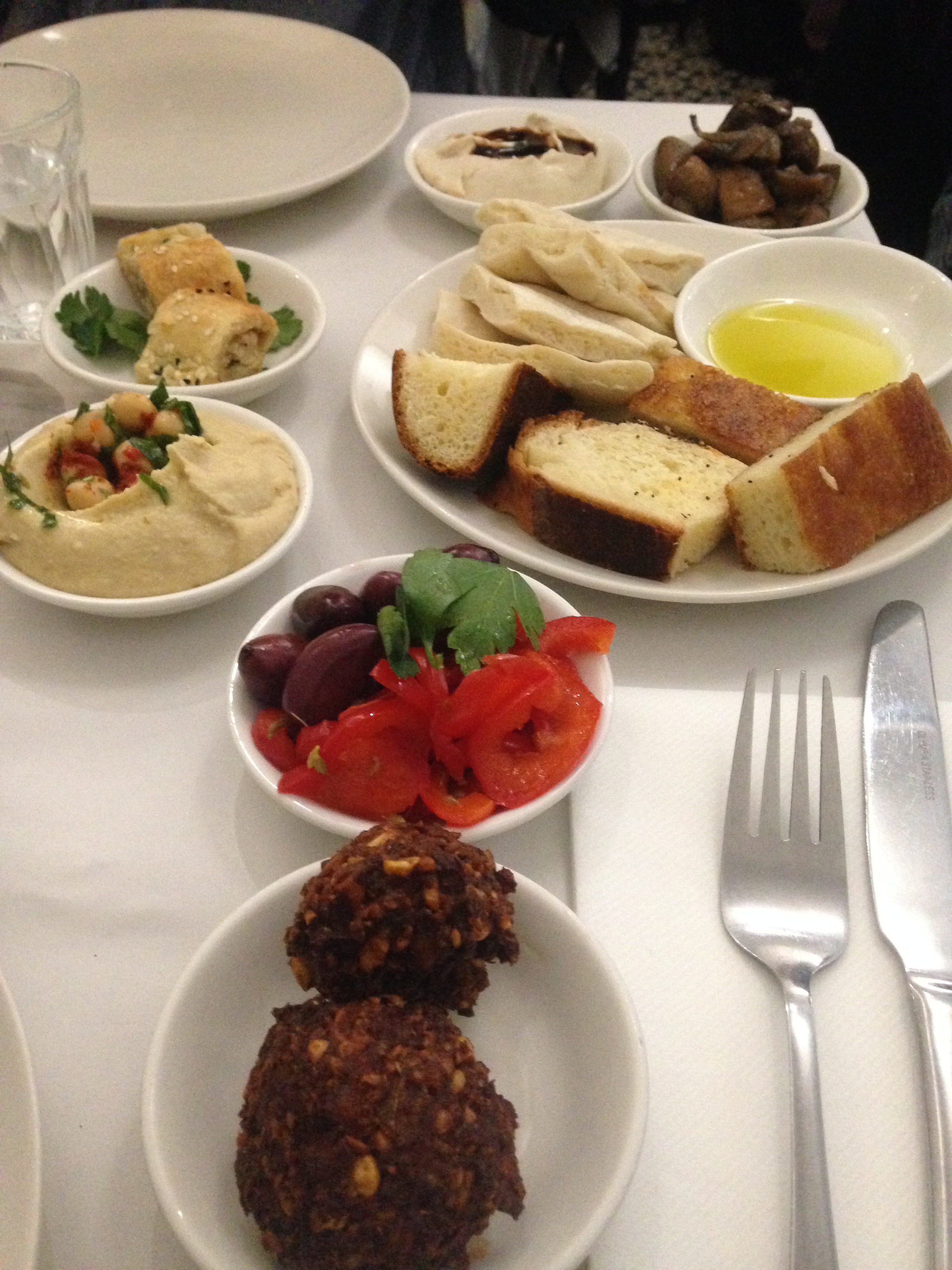 I’ve been so excited to go to Honey and Co since I got the recipe book for Christmas and today I finally got to visit. When we arrived I was surprised by how small the space was and how many people they had managed to squeeze in! Despite being a weekday, the restaurant was busy and we had to wait a few minutes for a table, which gave us time to watch all the dishes being served and therefore become extremely hungry. I really loved the atmosphere of the place, busy and bustling with an authentic feel of a middle eastern restaurant. We were seated by a really lovely waitress and we had already decided on the sharing mezze so we could get a taste of everything. There was a such a great selection including houmous, butternut squash and cinnamon falafel with tahini and burnt molasses sauce, olives and lightly pickled red peppers, a few different breads with olive oil, winter tomato salad and a gorgeous quince, ricotta and hazelnut salad. The stand out dishes in the mezze for me were the falafel and tomato salad, completely delicious and moreish- I would definitely order the falafel starter when I visit again. I also ordered some homemade orange blossom iced tea, the floral taste took me aback at first, but as the tea flavour settles in the drink becomes really delicious.