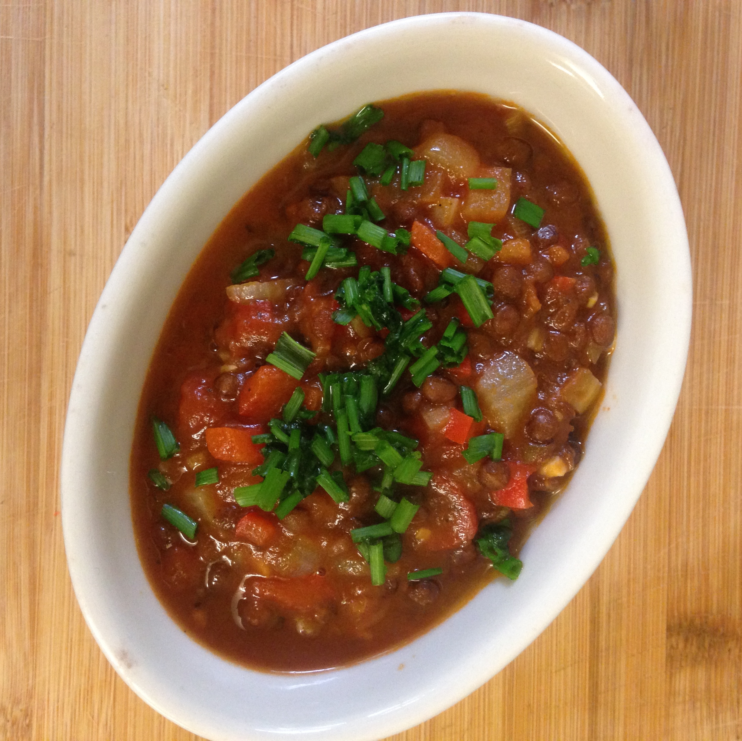 Heat 1 tablespoon of the oil in a large saucepan until very hot, then add the onion and red pepper. Fry for 5 minutes until the onion is translucent and the pepper softened. Add the garlic and fry for a few more minutes before adding the lentils, tomato puree and the remaining oil.