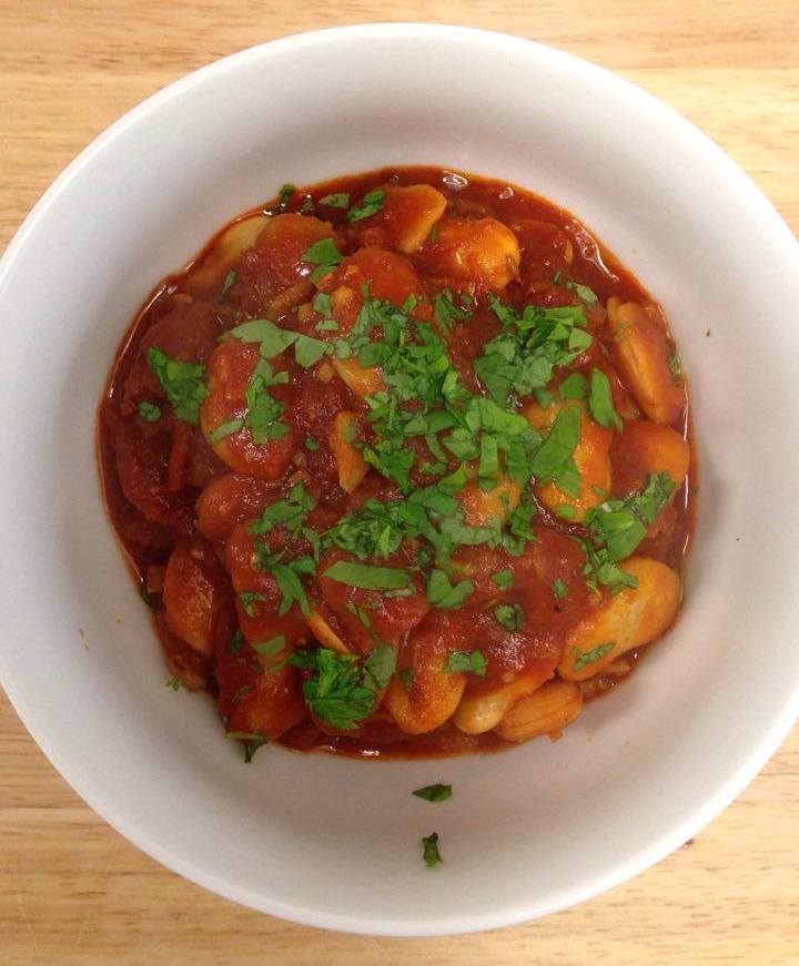 Fry for 5 more minutes then add the chopped tomatoes and butter beans with their water. Season with salt and pepper and cook for 15 minutes on a medium heat with the lid on, before removing the lid and cooking for 10 more minutes. Serve with some fresh parsley and enjoy!