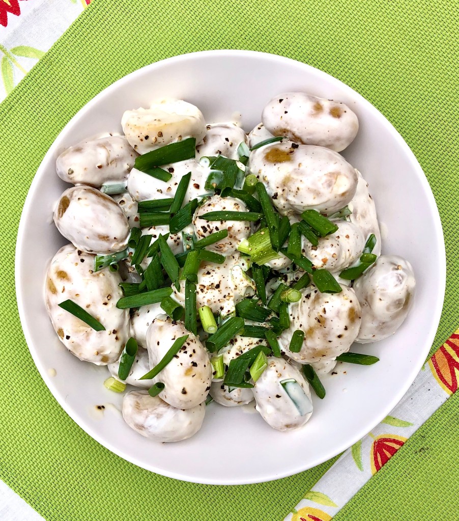 - Add the dressing to your potatoes and top with some sliced spring onions and more black pepper