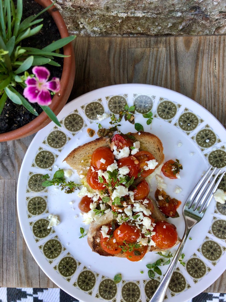 I’ve never been a salad person, so when the weather gets sweltering it can be hard to find a summer lunch that isn’t just a concoction of leaves, grains and dressings (as lovely as that sounds). So naturally, I often resort to *things on toast*, and this is my new favourite. It’s in part inspired my a baked feta recipe by MOB Kitchen that I absolutely love, and make weekly. I love the combination of sweet and sour tomatoes with salty feta and capers and earthy oregano. But instead of leave it at that and call it a tomato salad, I’m going to have it on rye toast and it’s my perfect summer lunch.